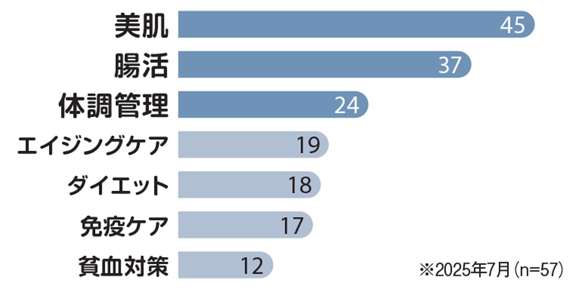 サプリメントや健康食品をとる目的は重複している人が多い。ただし、美肌と腸活の両方にひとつでアプローチしたり、エイジングケアや免疫ケア目的でとりながら体調管理につながるケースも。