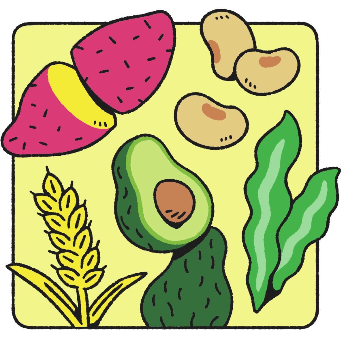大麦・豆類・ごぼう・玉ねぎ・アボカド・リンゴ・昆布