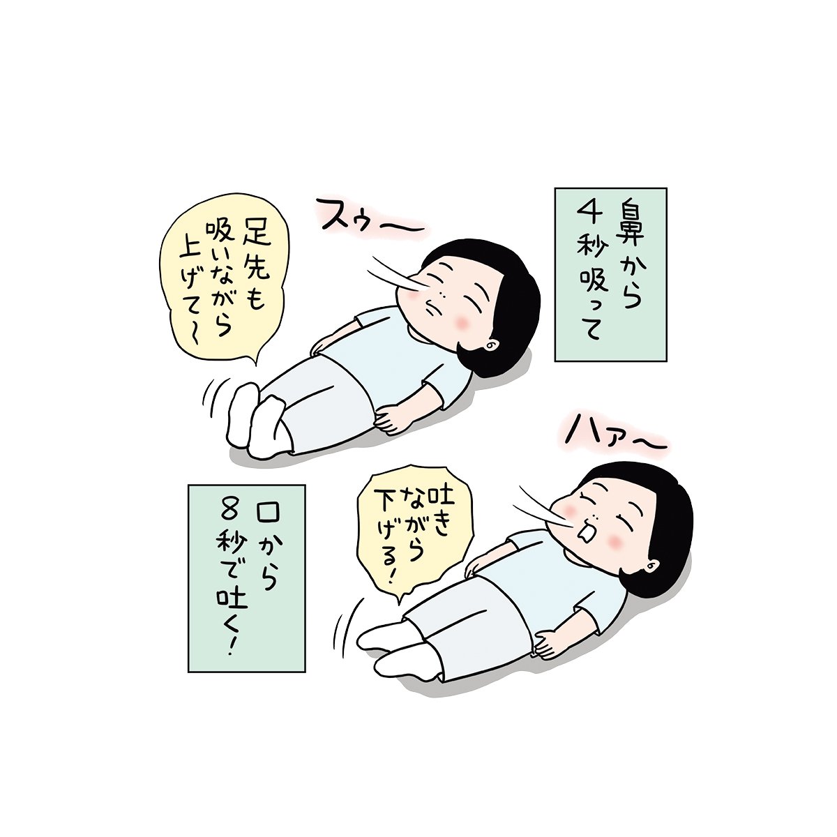 あお向けに寝て、息を鼻から4秒かけて吸いながら爪先を上げる。8秒かけて口で吐きながら爪先を倒す。