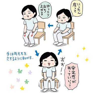 イスに座って両ももに手を置き、ももをさすりながらゆっくりと立ち上がる。ひざがつま先より前に出ないように注意。その後、ゆっくりと腰を下ろす。これを10 回繰り返す。