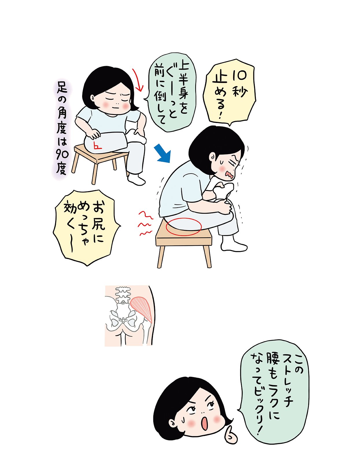 イスに座り、片方のひざを90度曲げて反対側のももに足を乗せ、上体をまっすぐ前に倒す。10 秒キープして元に戻す。