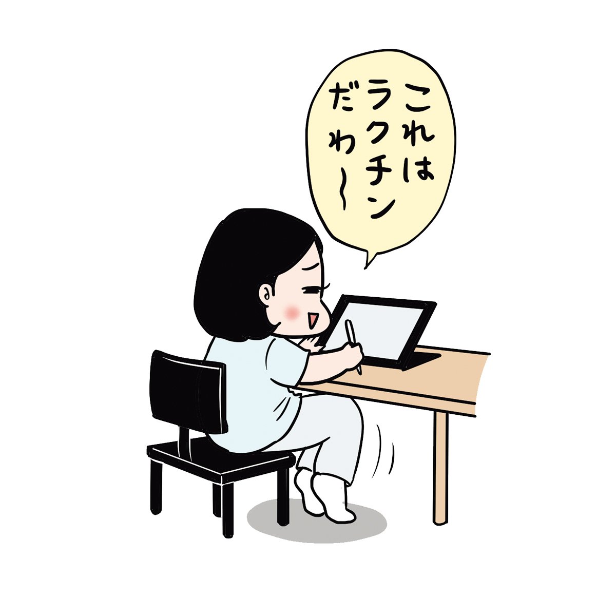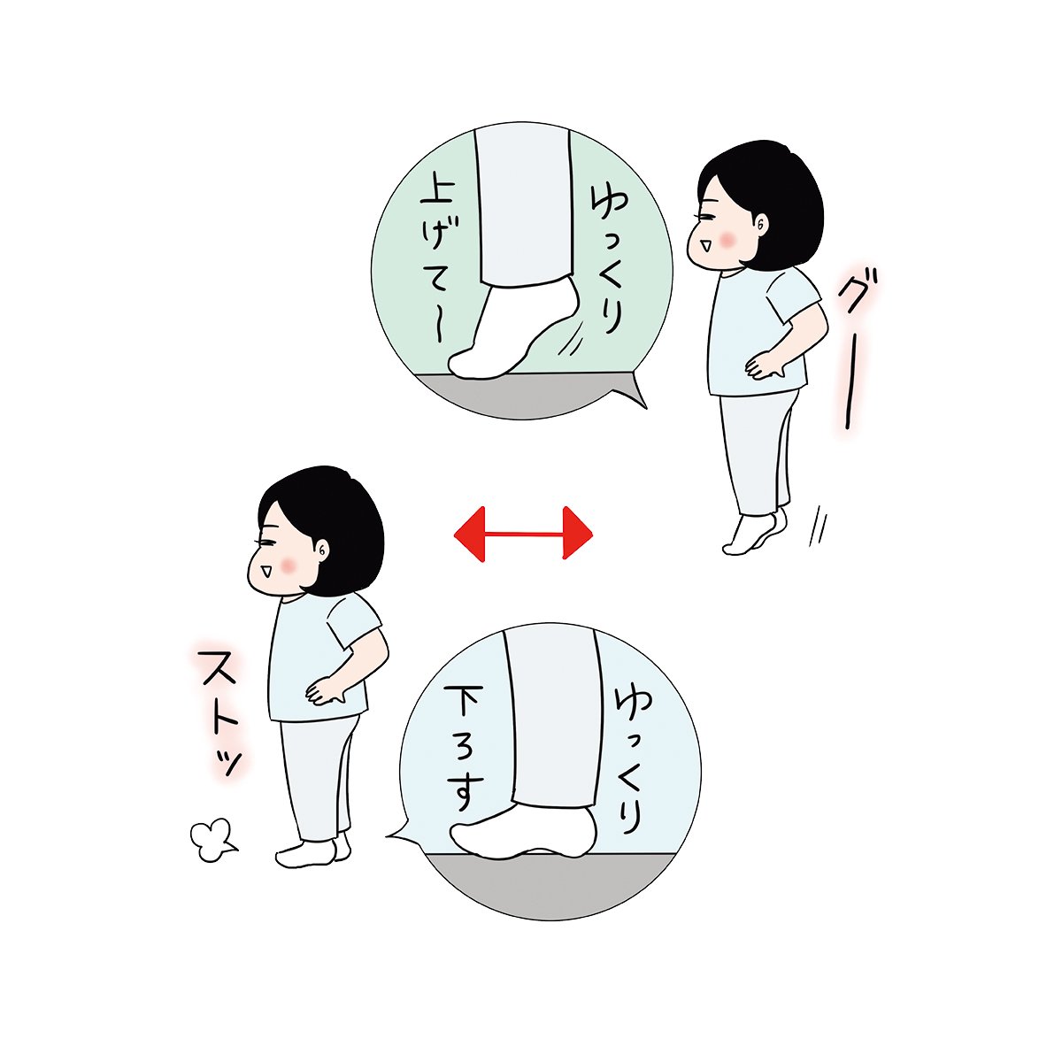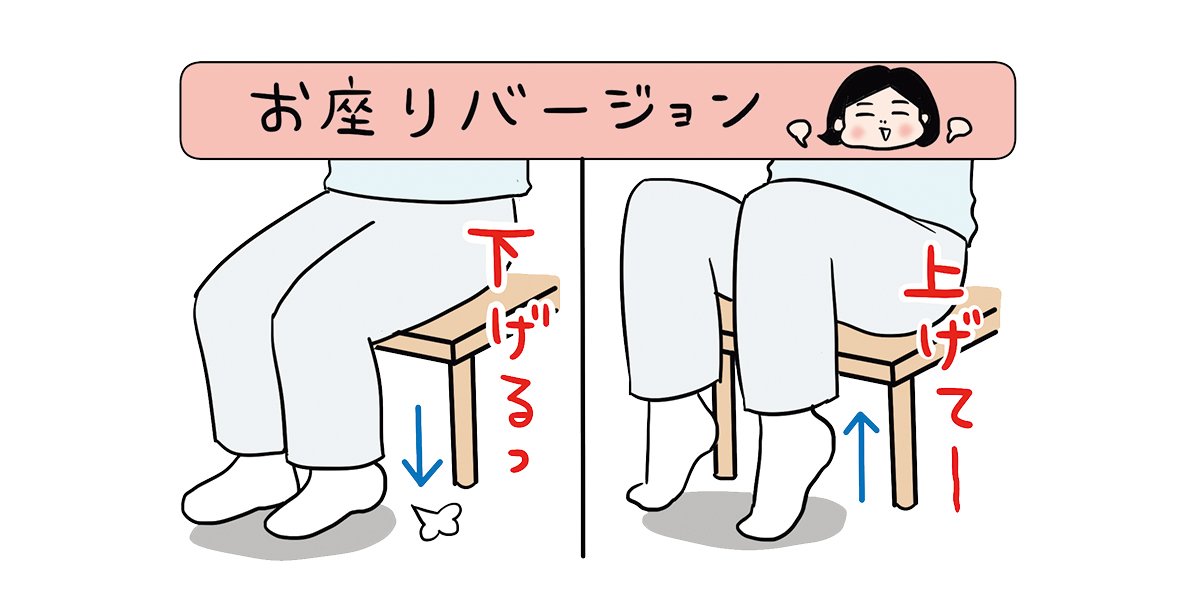 イスに座ったまま、かかとをゆっくり上げて、床で音を立てるようにストンと下げる。