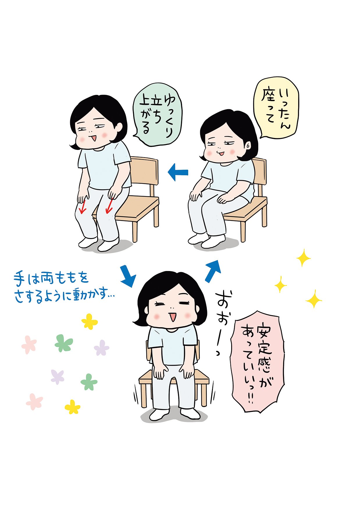 イスに座って両ももに手を置き、ももをさすりながらゆっくりと立ち上がる。ひざがつま先より前に出ないように注意。その後、ゆっくりと腰を下ろす。これを10回繰り返す。