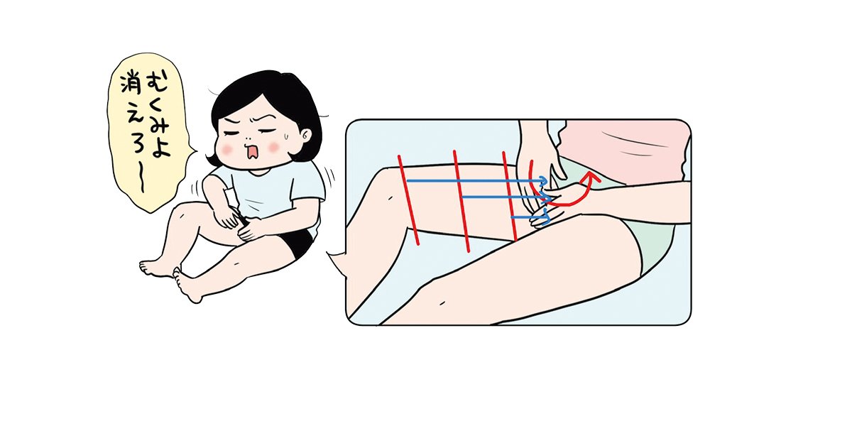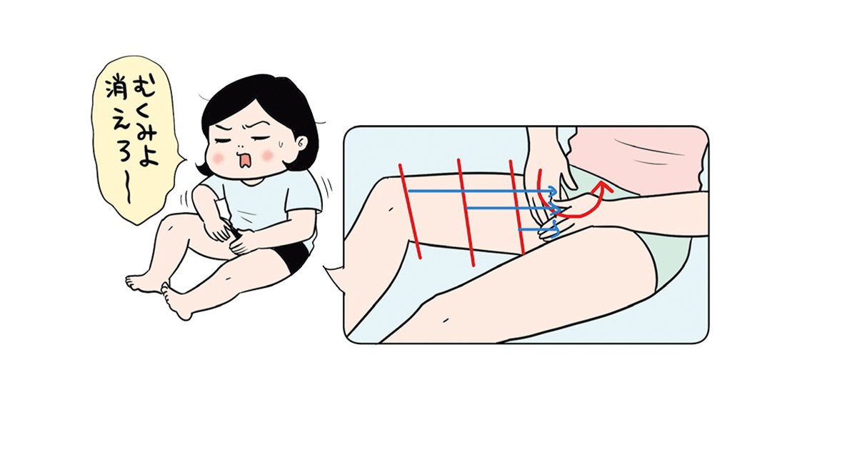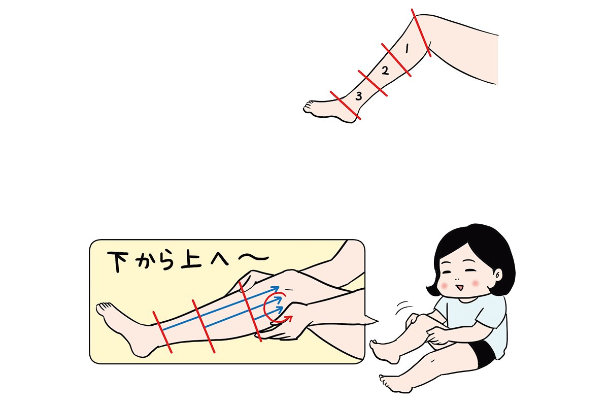 ひざ裏に手を当てて円を描きながら4回なでた後、(1)の部分を4回ひざまで、なで上げる。(2)(3)も同様に流したら、最後に両手で足全体を包みながら、足先から足のつけ根までまんべんなく流す。