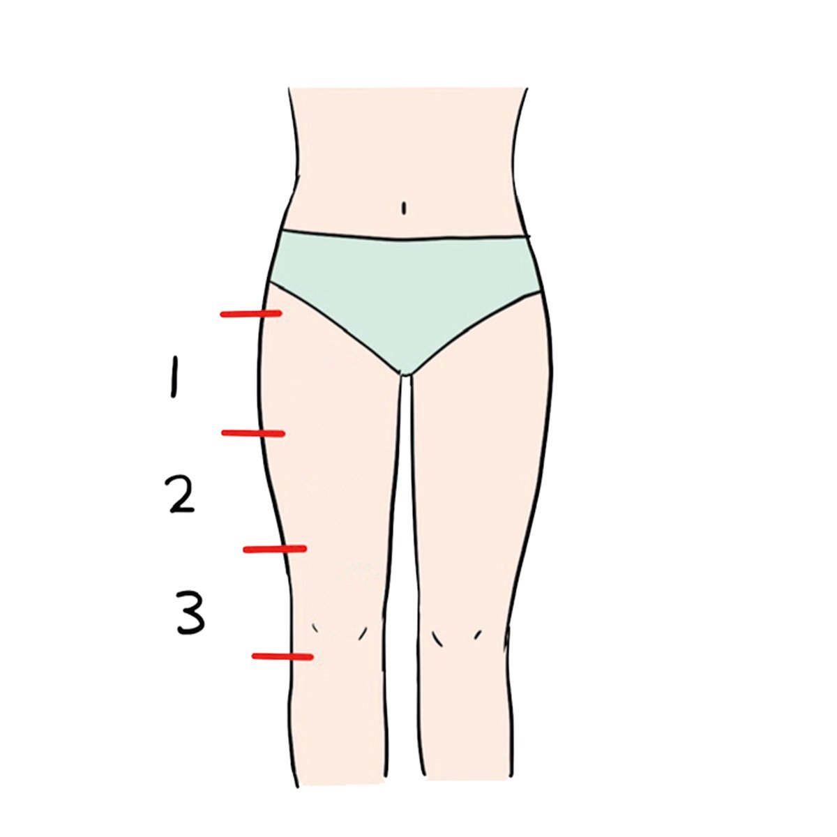 足のつけ根に両手を当てて円を描くように4回なでた後、太ももを3等分した(1)の部分の内側をそけい部に向かって流す。(2)(3)も同様に。