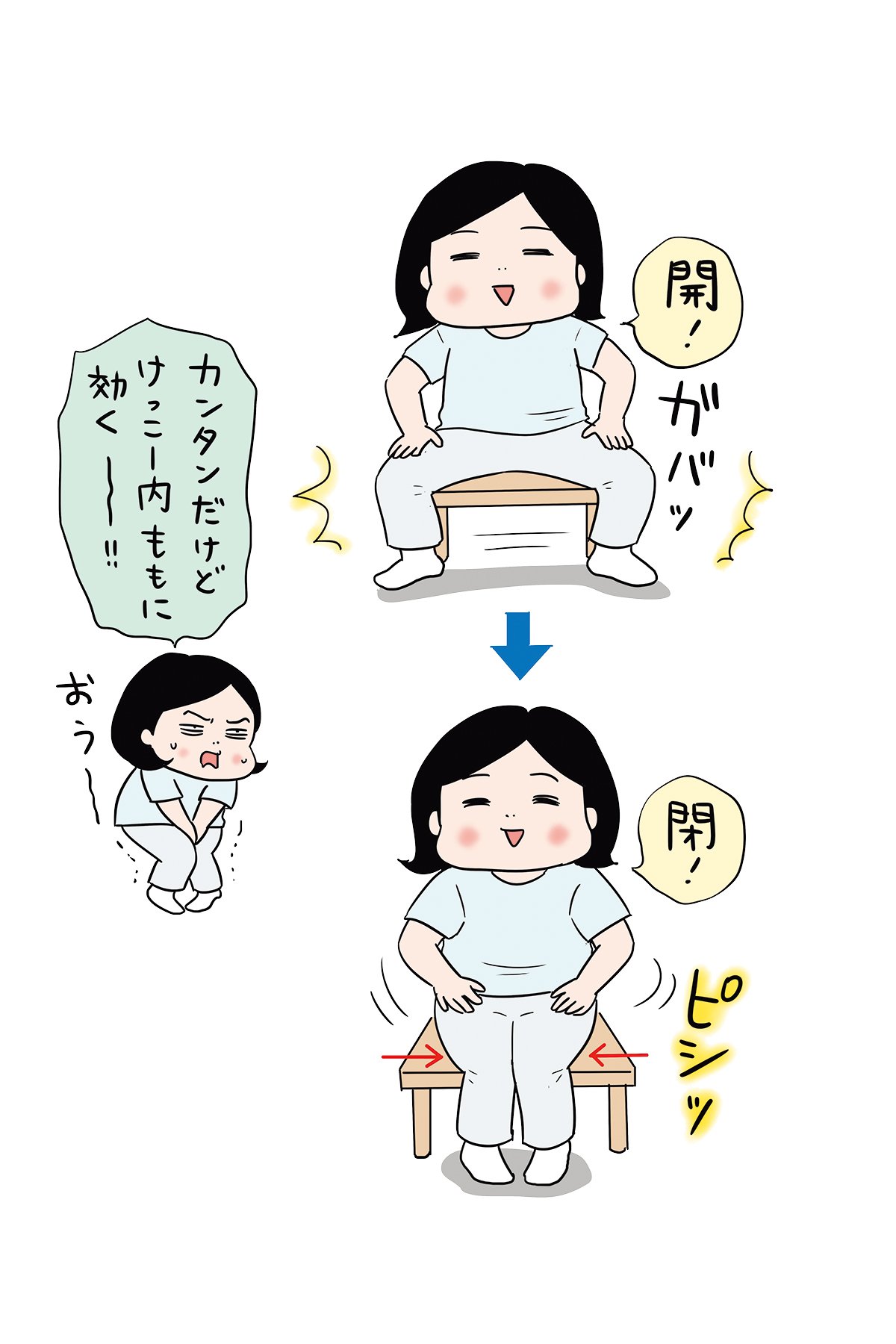 イスに浅く座った状態で姿勢を正し、両ひざを左右に大きく開いて爪先を床につけ、すぐに閉じる。足のつけ根から大きく開くように意識して。