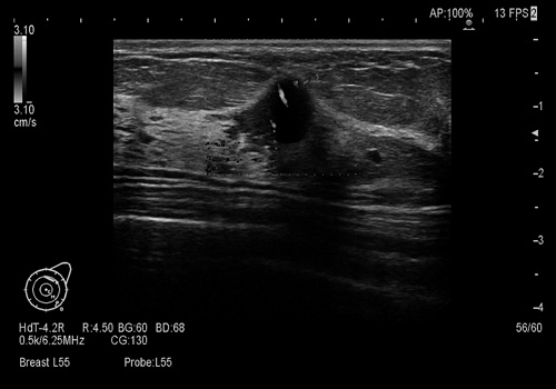 超音波で見える画像。中央に丸く見えるのが、がんのしこり。若い世代の乳房でもよく見える。