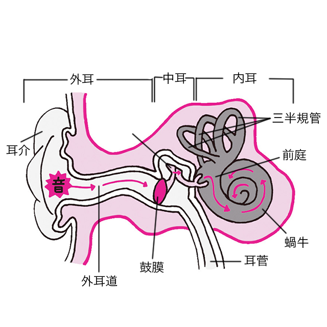耳に入った音は、外耳道を通って鼓膜を揺らす。その振動が中耳にある耳小骨経由で内耳の蝸牛に伝わり、そこで電気的信号に変えられる。その後、聴神経を通って大脳へと伝えられた信号を大脳皮質の聴覚をつかさどる部位がキャッチした時点で、初めて音として認識される。