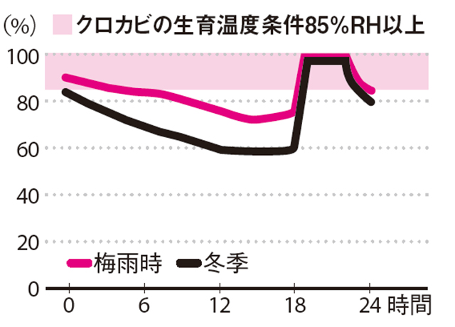 浴室使用時の温度は梅雨も冬も同じ25℃程度。湿度は99%以上。そこに水アカや石けんカス、皮脂汚れなどのエサがそろえば、クロカビ繁殖は必至。冬だからといって油断は禁物!
