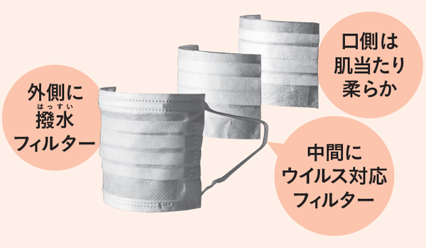 効果が異なるフィルターを重ねて構造することで、高機能かつ優しい肌触りを実現。あご下まで広げられる不織布のプリーツタイプが使いやすくて◎。