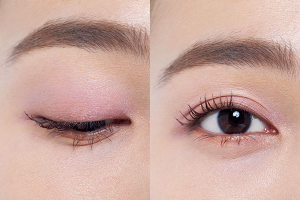 右を上まぶたのキワ〜アイホールの凹みの手前くらいまでぼかすことで、まぶたを膨張させずにピンクみだけをON。下まぶたは左を黒目の下だけにのせる。マスカラはダークブラウンを使い、上下のまつげに根元からたっぷり重ね塗り。