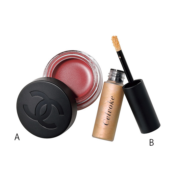 カギとなるのは質感が異なるふたつのチークのレイヤード。クリームチークを広範囲へ大胆に、そして薄く広げ、ナチュラルに上気したような血色感を。そこに上からリキッドラメを頬骨に広げて。頬骨のいちばん高い位置にだけさらにラメを指でぽんぽんと点おき。色っぽさとかわいさが同居したチークが主役の春デートメイクが完成!
