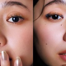 左上を眉下からまぶた全体に広げる。アイホールの頂点と、その高さまで目頭、目尻からそれぞれ線を垂直に伸ばしたエリア内に左下を塗り、涙袋にも薄く入れる。太ブラシに左下をとり、鼻筋のわきにノーズシャドウとして軽くのせる。
