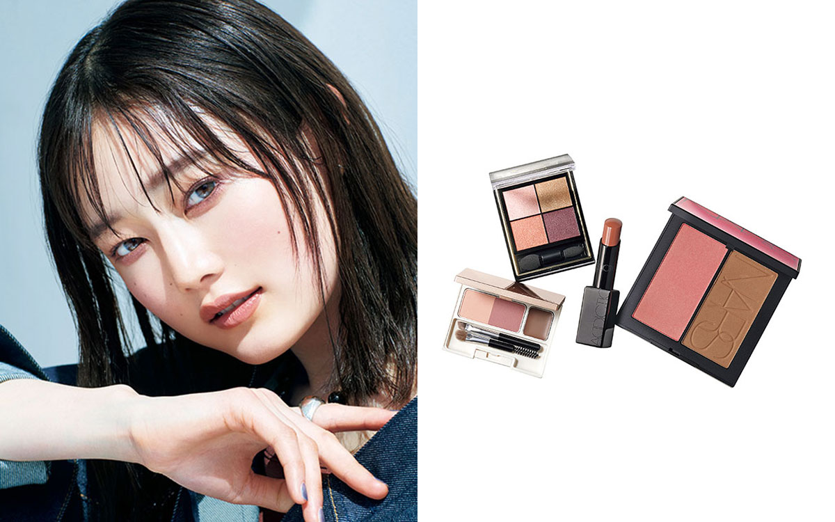 今回は眉とまぶたにピンクパープルを集中させつつ、唇と頬にはブラウンニュアンスも含ませてメイク。すると、より品が生まれ、凜とした大人の夏顔が完成!