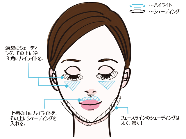「 涙袋にあえてシェーディングを入れる ことで目の位置を下に見せ、その分面長さんの悩みがちな頬がスッキリと見えます。 人中やあご周りの陰影も顔の長さをカムフラージュ してバランスを整えるのにおすすめ」