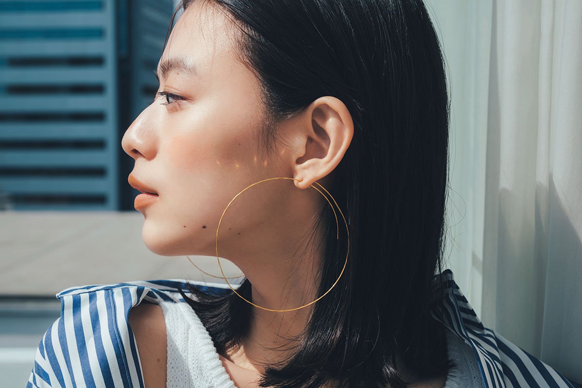 安定した人気を誇るフープピアスは、線が細め&ビッグサイズを選ぶとたちまち更新感が!大人っぽくてリッチな印象なので、ミルキーオレンジのリキッドチークを頬の内側からのばし、あどけなさをON。予定調和で終わらない、ドラマティックなバランスが実現。