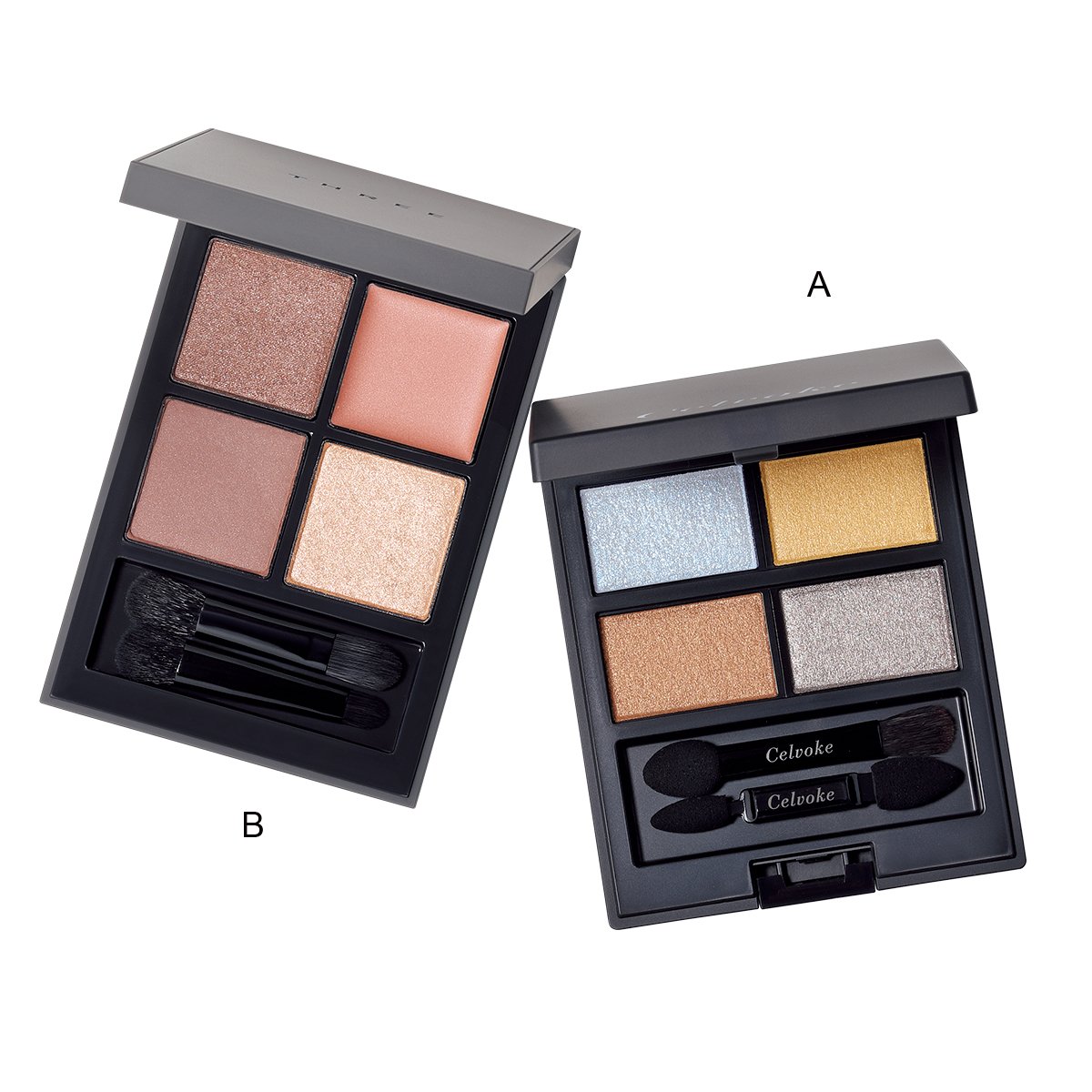 Bの右上を上まぶた全体になじませて、左下をアイホール狭めに重ねる。左の2色を混ぜて下まぶたのキワ全体に。