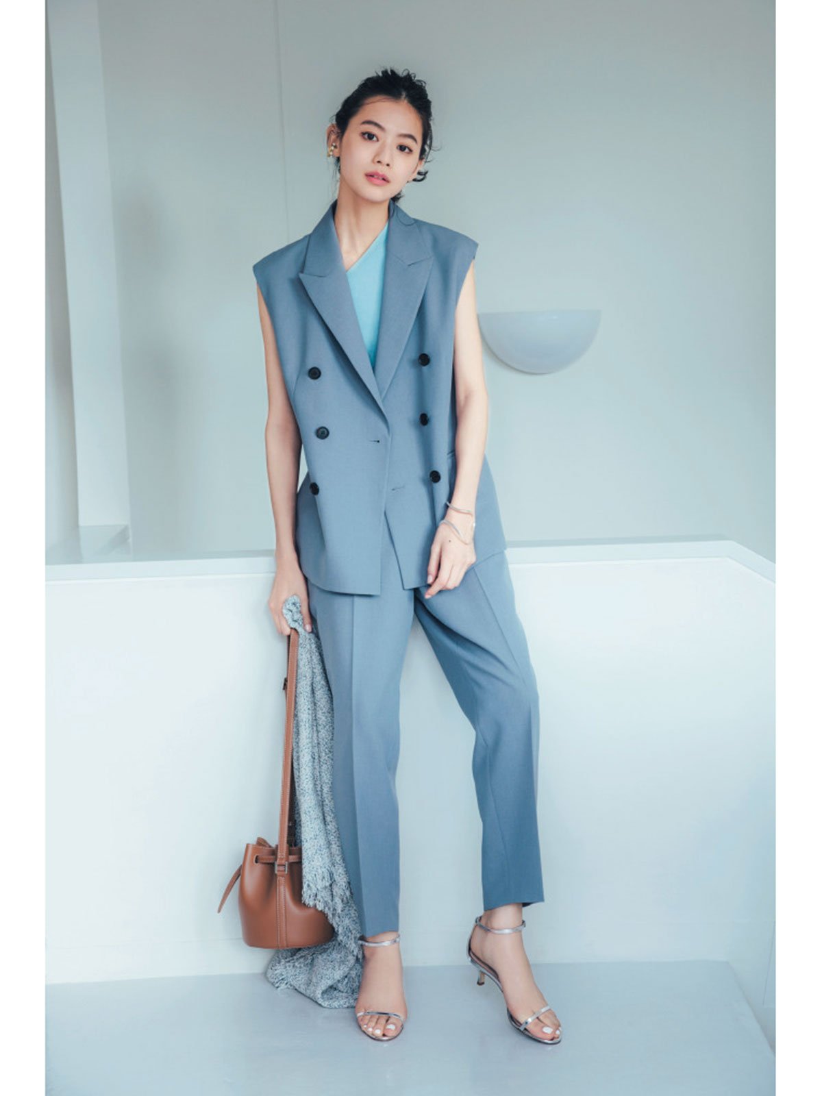イヤーカフ[パール]¥26,400(e.m.青山店〈e.m.〉) イヤーカフ[ゴールド]¥13,200(アルティーダ ウード〈アルティーダ ウード〉) ニット¥13,200(プラージュ 代官山店〈プラージュ〉)、ジレ¥12,100、パンツ¥11,550(ミラ オーウェン ルミネ新宿2店〈ミラ オーウェン〉) バッグ¥39,600(ヴァジックジャパン〈VASIC〉) 靴¥57,200(デミルクス ビームス 新宿〈ネブローニ〉) ストール¥31,900(アイネックス〈アソース メレ〉) バングル¥55,000(e.m. 青山店〈e.m.〉)