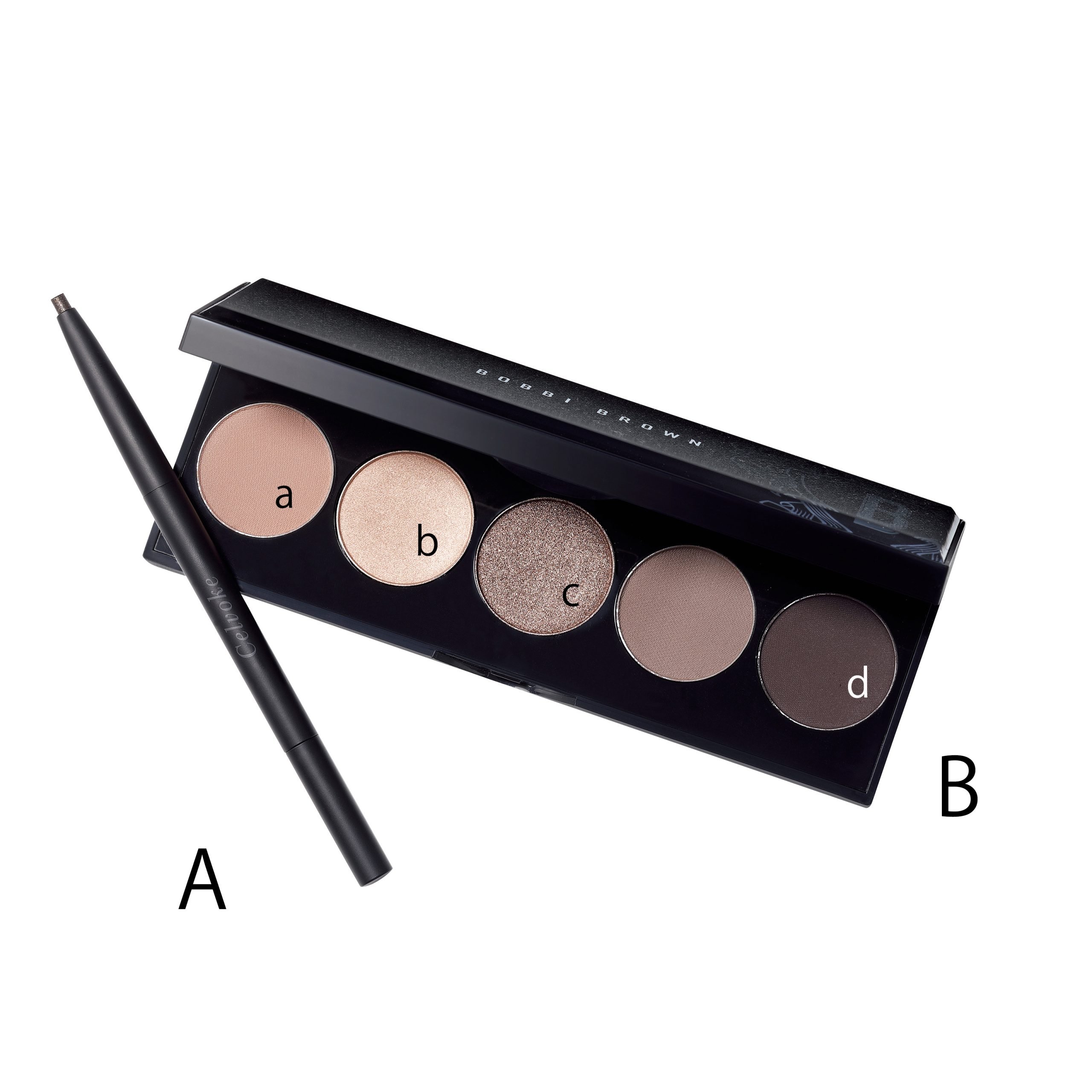 まぶたのくぼみまでの眉下部分にaを入れ、アイホールにbを。Aのアイライナーはほんの少し目尻長めに上まぶたのキワに引き、目尻1/3のみにdを重ねる。下まぶたは目のキワにチョンチョンとおくようにAでラインを入れ、cを細く重ねる。