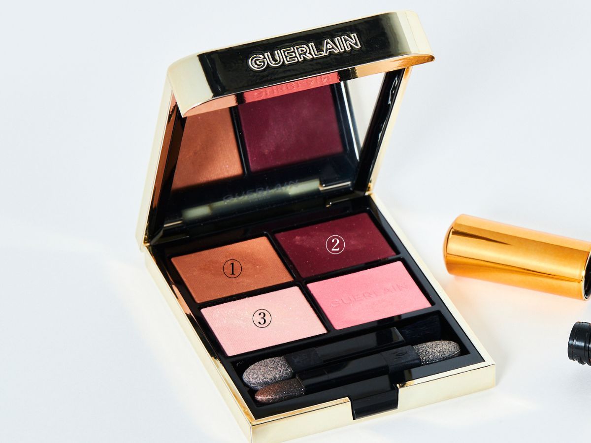 「ラブ・ライナー リキッドアイライナー ダークブラウンで上まぶたのキワにラインを描き、ゲラン オンブル ジェ 530の②をラインの目尻側1/3に重ねて目尻側だけで締める感じに。③は目頭を>の字に囲みながら上まぶたの①の上までのばし、目元を明るくします。はっきりした顔立ちのせいか目元に強い色を使うと抜け感がなくなってしまうため、メイクアップアーティストさんなどいろいろな人の意見をうかがいながらアイメイクを模索中!」