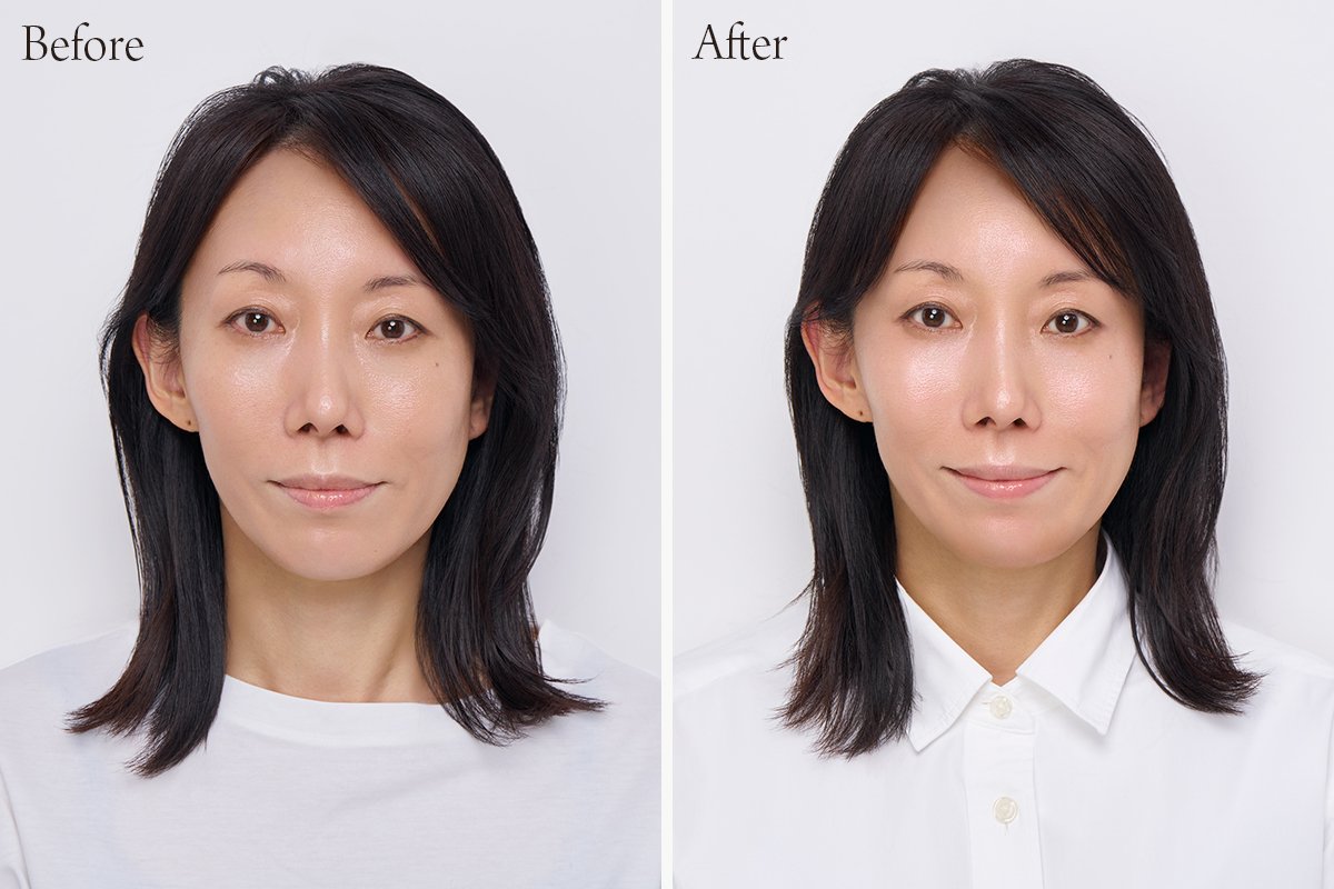 膨張しがちな顔をいかに引き締めるかがメイクの要となるのがこのタイプ。特にエイジングを重ねると顔がぼやけがちなので、顔にメリハリをつけるために、シェーディングとハイライトはとても大切です。シェーディングは、濃淡のある2色のベージュを混ぜて、顔に立体感をしっかりと。ハイライトは指で少量を点置きして自然な立体感を出すことがナチュラルにメリハリ顔になるポイントに。