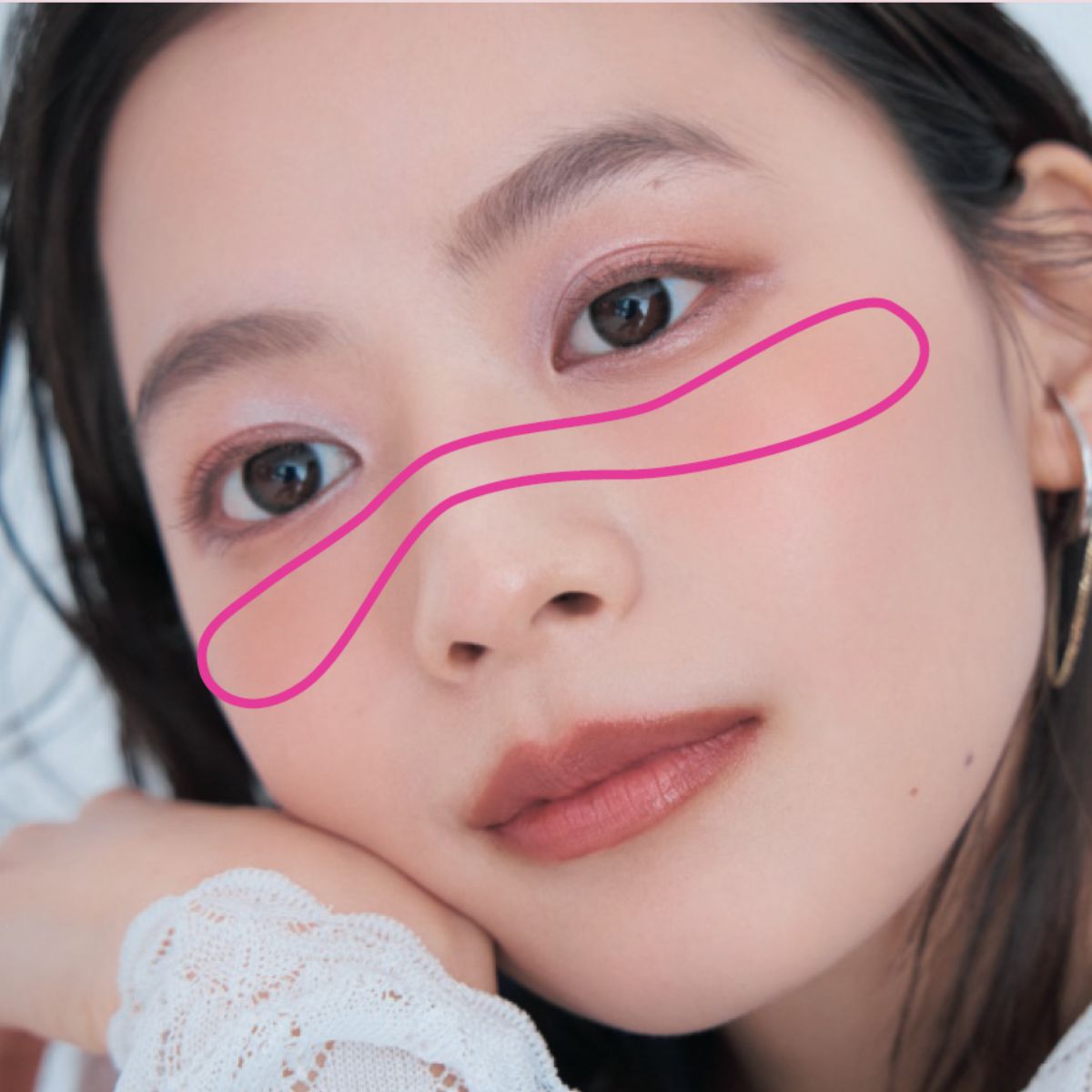 パール入りのツヤベージュは、こめかみから鼻横に向かって3角形にシェーディングのように入れることで、引き締まった印象をかなえてくれます。白を1滴混ぜたような肌なじみの良いまろやかピンクを頬中央から楕円に入れることによって、じゅわっとにじむような血色がプラスされ、上品さとハッピー感を兼ね備えたほっぺが完成!