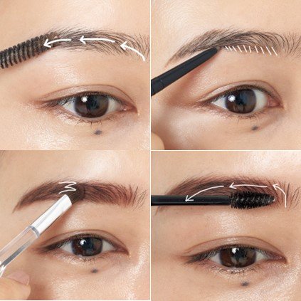 眉頭を立ち上げるようにaを当て、中間~眉尻は外側に向かって毛流れを整えるようにとかす。