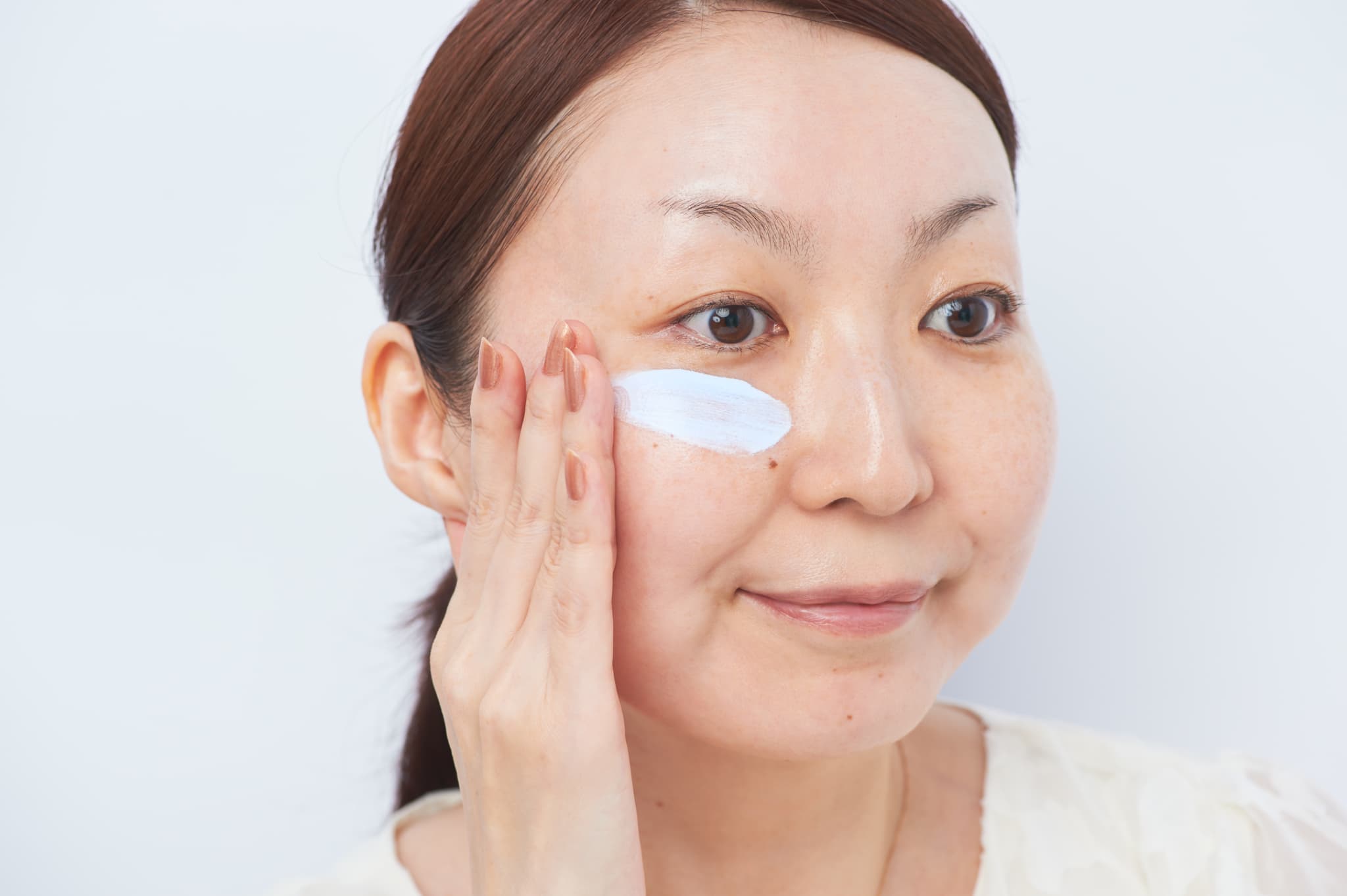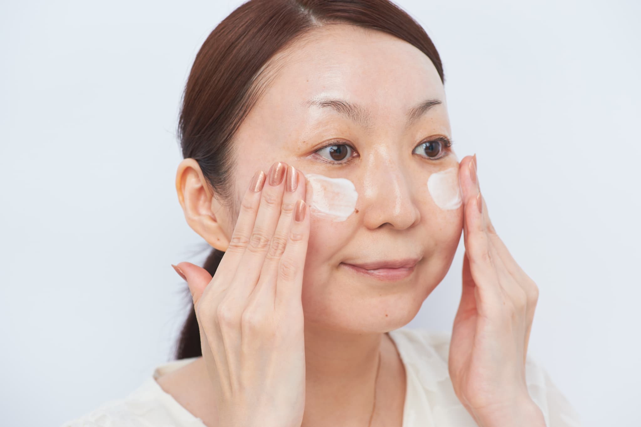 次に乳液を100円玉ほど手に取り、顔全体にくるくるとなじませます。小鼻の溝などの細かい部分まで丁寧に入れ込んで。 少しペトっと吸い付くくらいになればOK。表面に残った余分な油分だけをティッシュオフすれば、一日中くずれにくい理想の肌バランスに仕上がります。