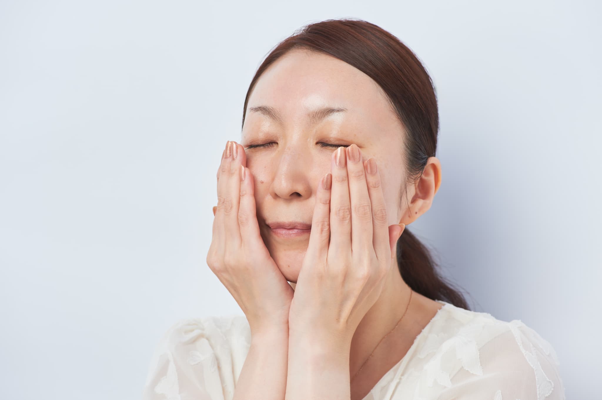まずはスキンケアから。表面を濡らすだけでなく、内側に水分を徹底して満たすことが、にごりのない発光肌への近道です。 化粧水をコットンで全体になじませ、次に手のひらで顔全体を優しくプレスするように押し込んでいきます。「これ以上入らない」というくらいまで潤わせて。