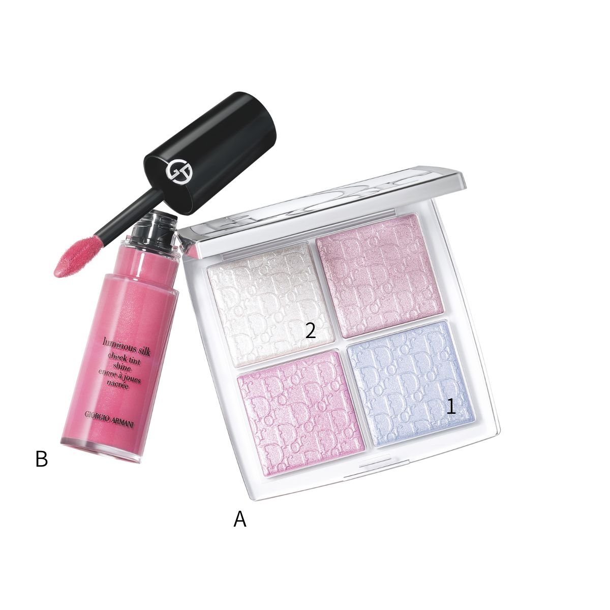 チークは主張しすぎずニュアンスと血色感をナチュラルに仕込むのが今の流れ。フェミニンさんに似合うのは、やっぱりピンク! 肌の色を際立たせたいので、ブルベさんなら青みピンクを選ぶのが正解。ブルーのハイライトを組み合わせることでピュアさも加わり唯一無二の魅力を演出できます。まず最初にAの1と2を混ぜて黒目の下、頬の高い位置に小さな円形に入れ、さらにBを指にとり頬骨に沿ってふんわりぼかせば完成。透明感たっぷりハイライトを先に仕込み、チークを重ねることで内からにじむようなツヤと血色が生まれ上品にまとまります。