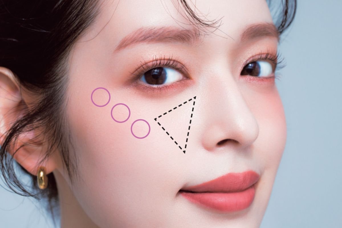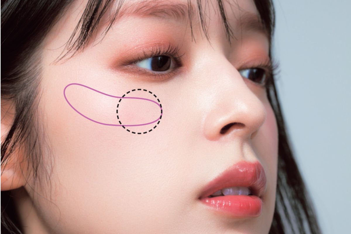 チークは外側、ハイライトは内側。血色と骨格を際立たせる。