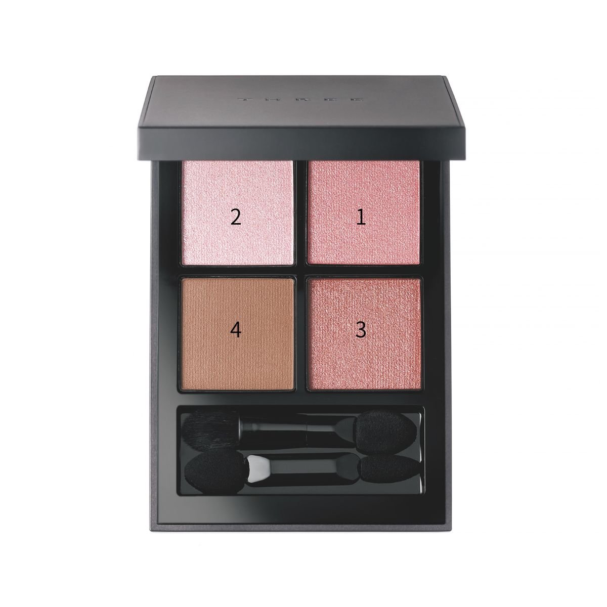2をアイホール全体に広げ、1と3を混ぜて上まぶた1/2に重ね、下まぶたにも塗る。4を上下まぶたの目尻側に“くの字”にオン。目尻に向かって濃くなるようグラデーションにすることによって、目の横幅が強調され、中顔面を短く見せてくれる効果アリ。