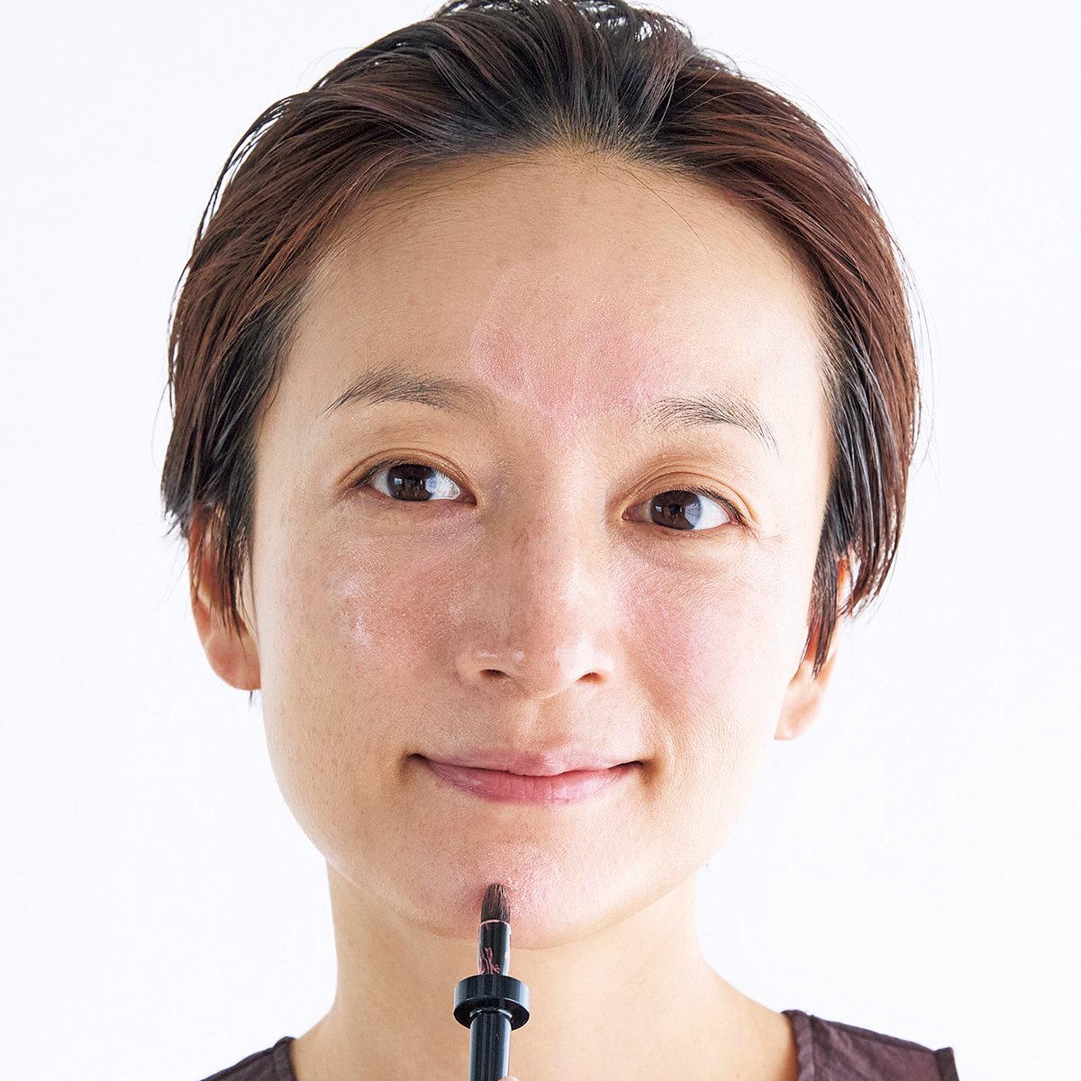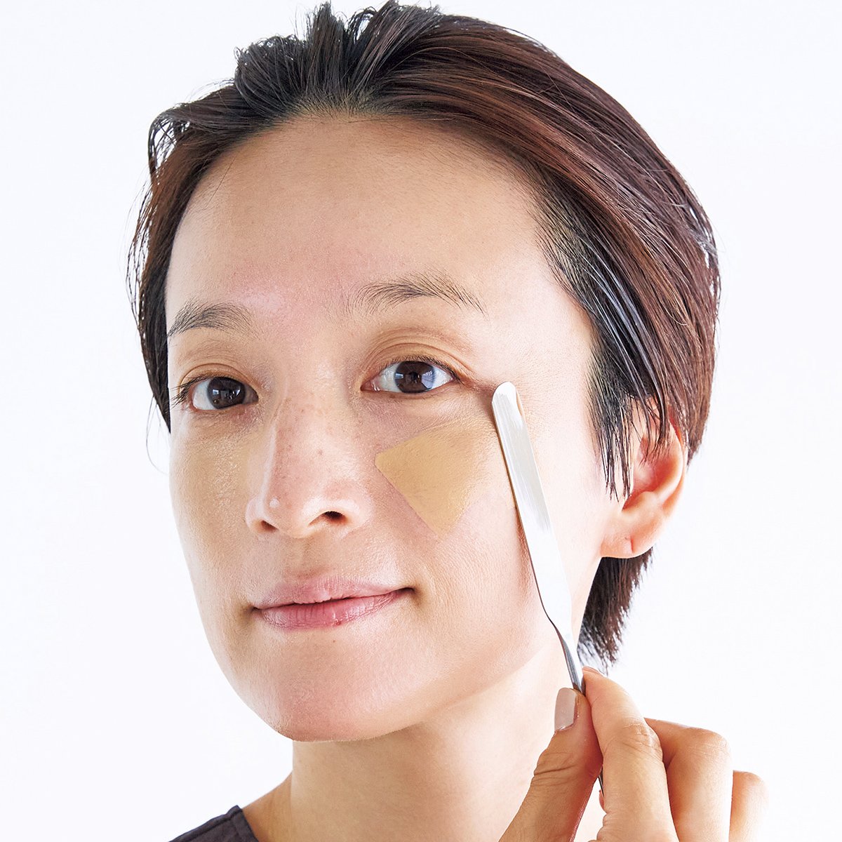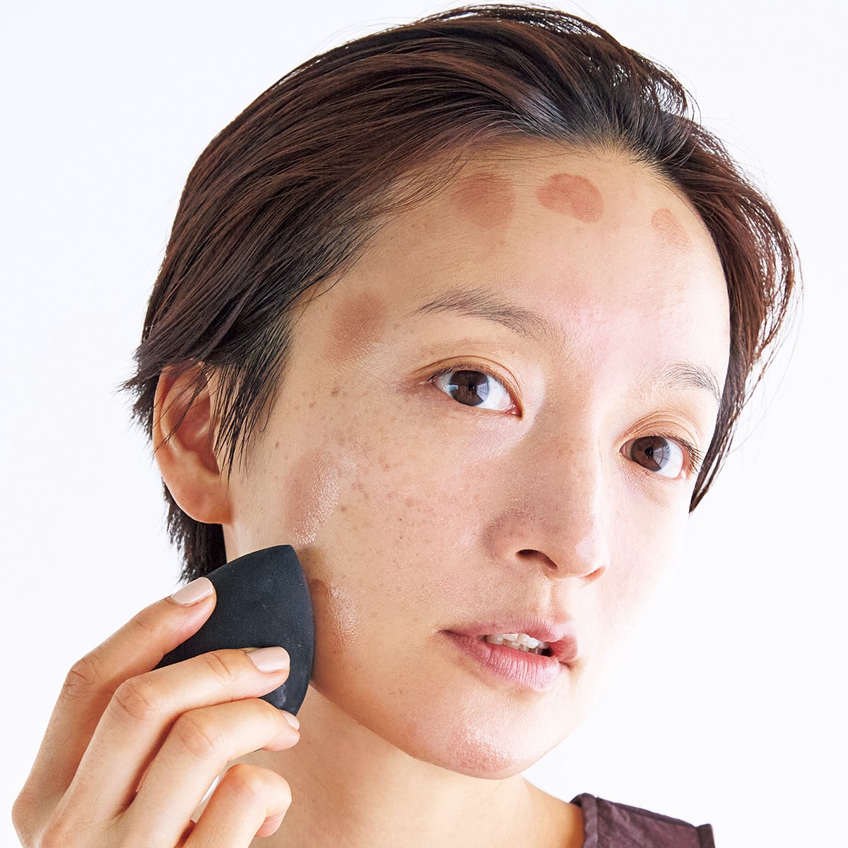 トーンアップ下地で顔全体のくすみをはらい、ハイライトとローライトで立体感を仕込み、スパチュラとスポンジを使ってゆる薄ファンデーションを薄く均一に密着させます。「メイク下地からファンデーションまで、すべてみずみずしい薄づきタイプで統一することが厚塗り感や毛穴&小ジワ落ちせず、ハリ艶印象をキープする第一条件です」(佐藤さん)