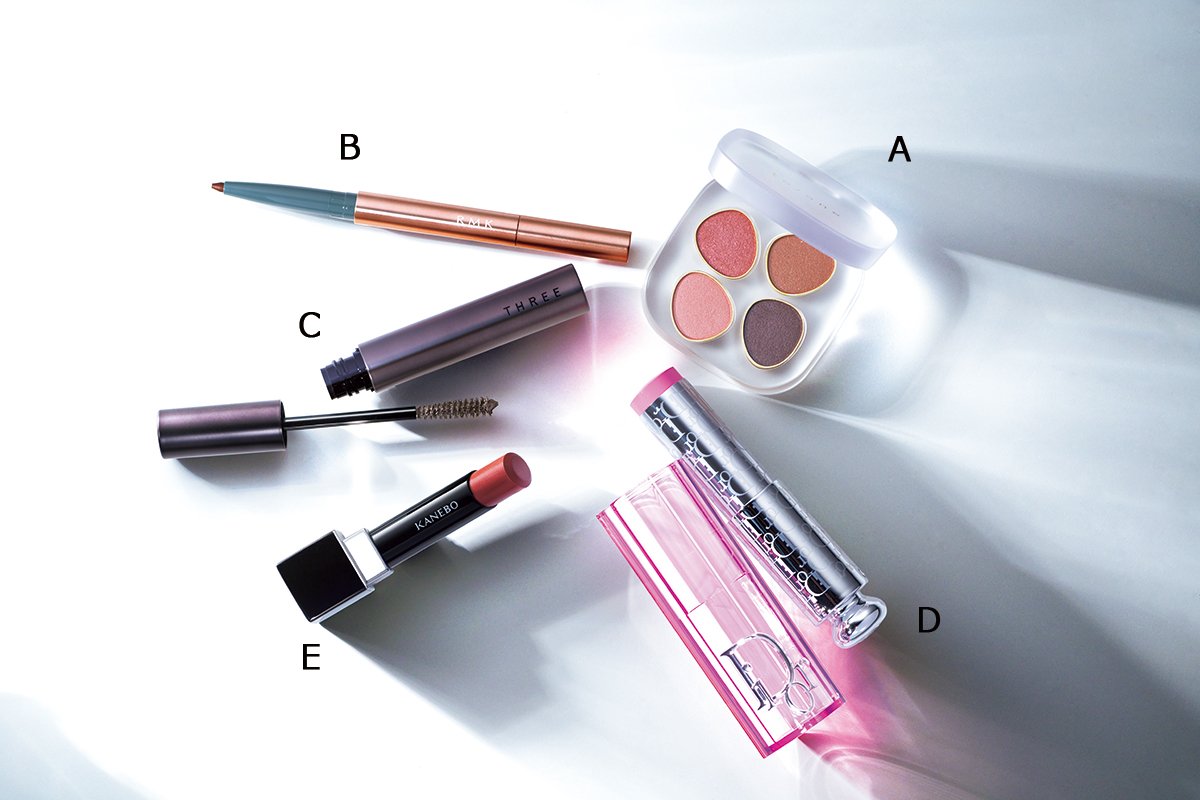 Bを上まぶたのキワに太く引き、チップでアイホールの方までしっかりとぼかし広げ、まぶたに陰影を仕込む。Aの右下を目尻に重ねてさらに陰影を深め、左上を上まぶたの中央にオン。左下を全体にレイヤードして色と質感を柔らかに調和。下まぶたの目頭には右上を。上下のまつげにCを丁寧に重ねて、繊細かつぱっちりと。