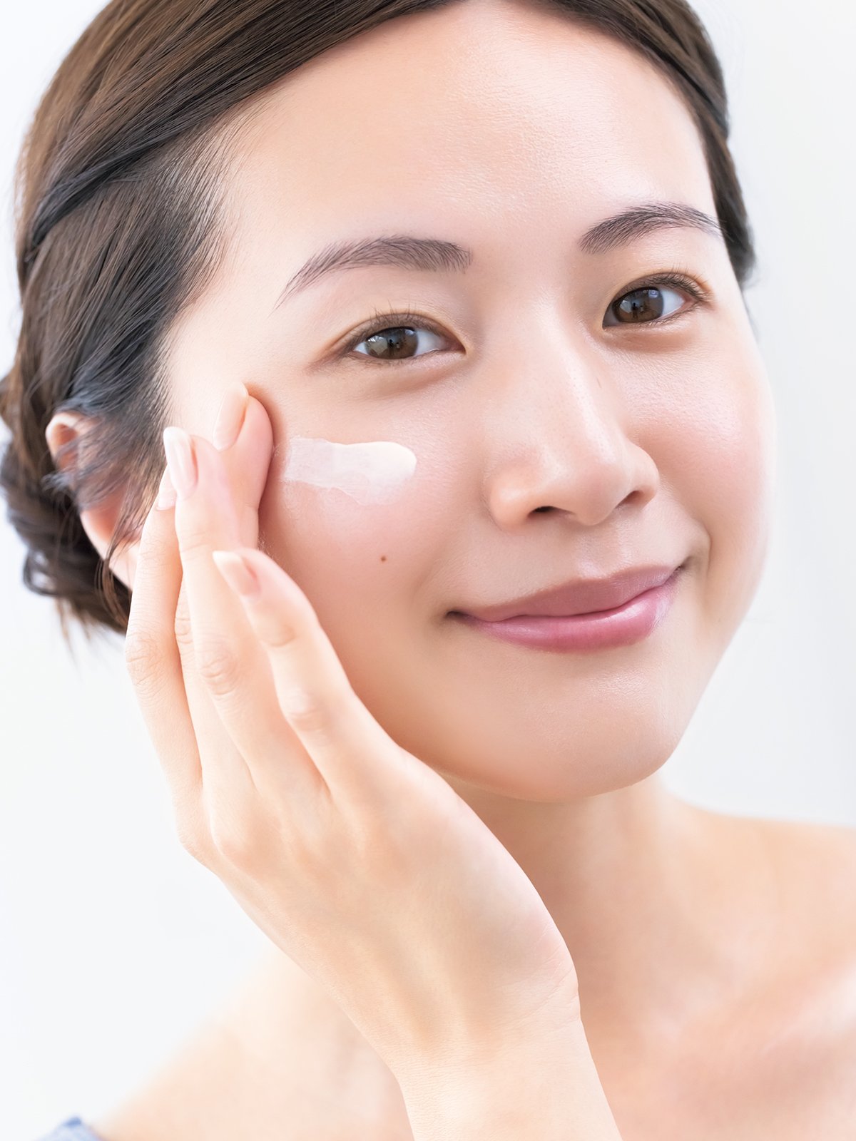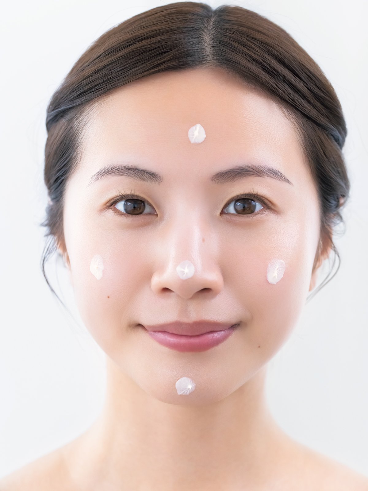 UVなどのベースは、手にとってから額、両頬、鼻、あごに点おきをする。次に、ソーッと指の腹でなでるようにして全体に広げる。