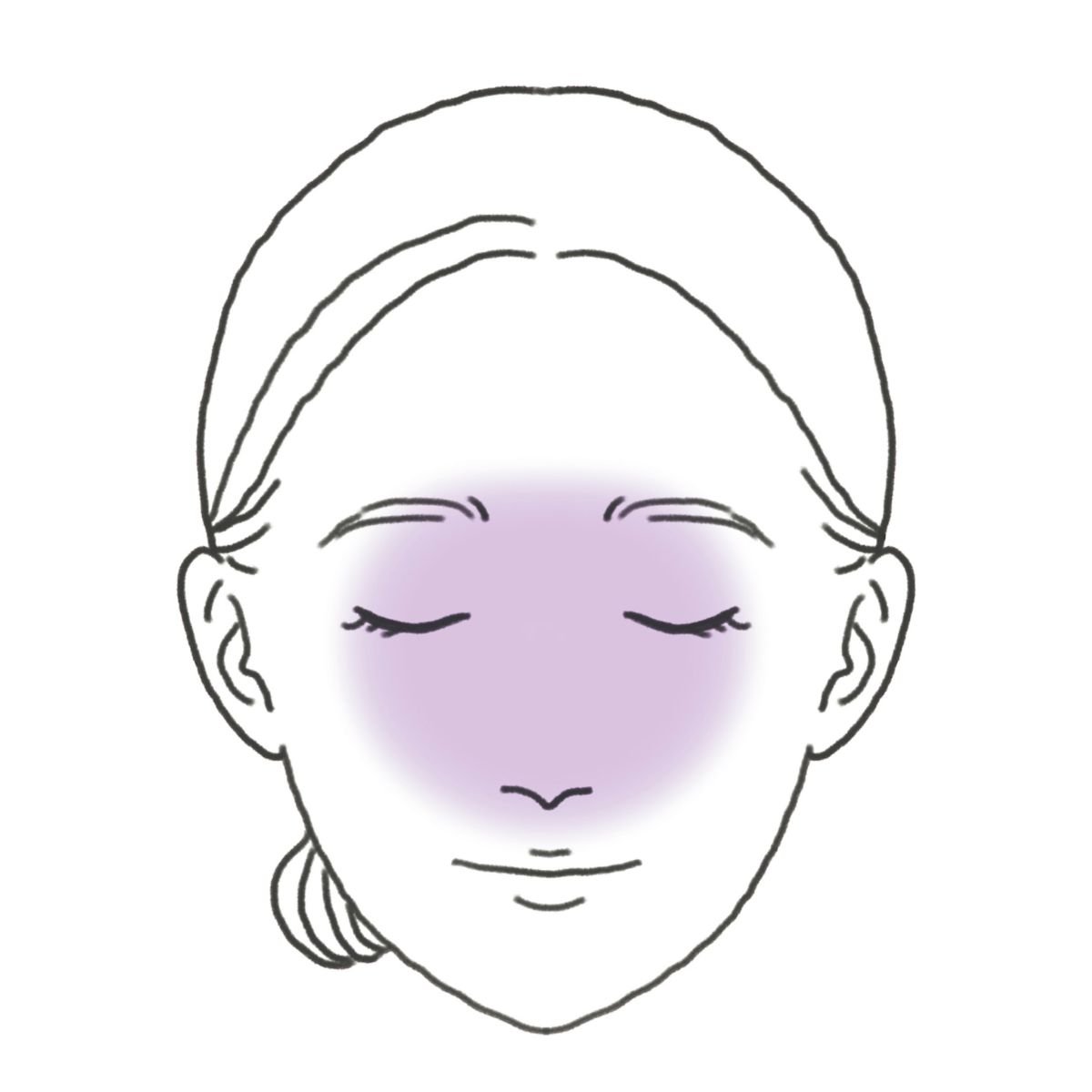 「黄ぐすみで悩んでいる人はラベンダーをチョイス。ブルーとピンクを混ぜるとラベンダーになる色の方程式どおり、ブルーの透明感とピンクの血色感、両方のいいとこどりをできるお得な色です。眉と鼻のつけ根を結んだラインから頬骨の角、上唇を結んだ円形にのせ、顔に透明感印象を」(河嶋さん)