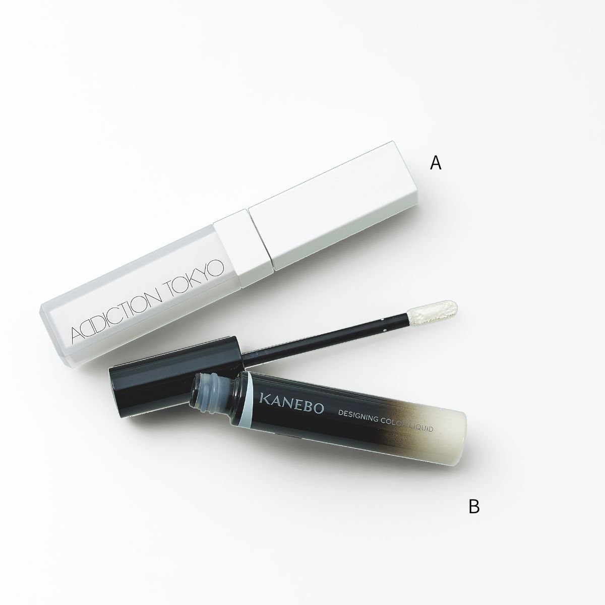 「赤みと黄みを同時に抑えて、透明感を出せる力強い味方がブルー。夏の間は全顔に塗って涼しげ肌を演出していましたが、秋冬シーズンは額、Cゾーン、目頭、まぶたの中央、鼻筋、鼻先、唇の山などに広めのハイライトとして使うのがイチオシ。澄んだブルーで立体感を出すのが今っぽい」(河嶋さん)