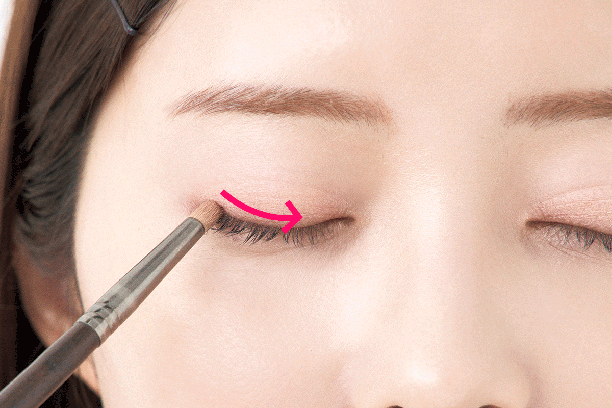 cのブラウンとbのピンクを混ぜ、上まぶたの目尻から黒目上までラインを細めに描く。目尻側に影を与え、目頭側は明るくすることでナチュラルな陰影感が誕生!