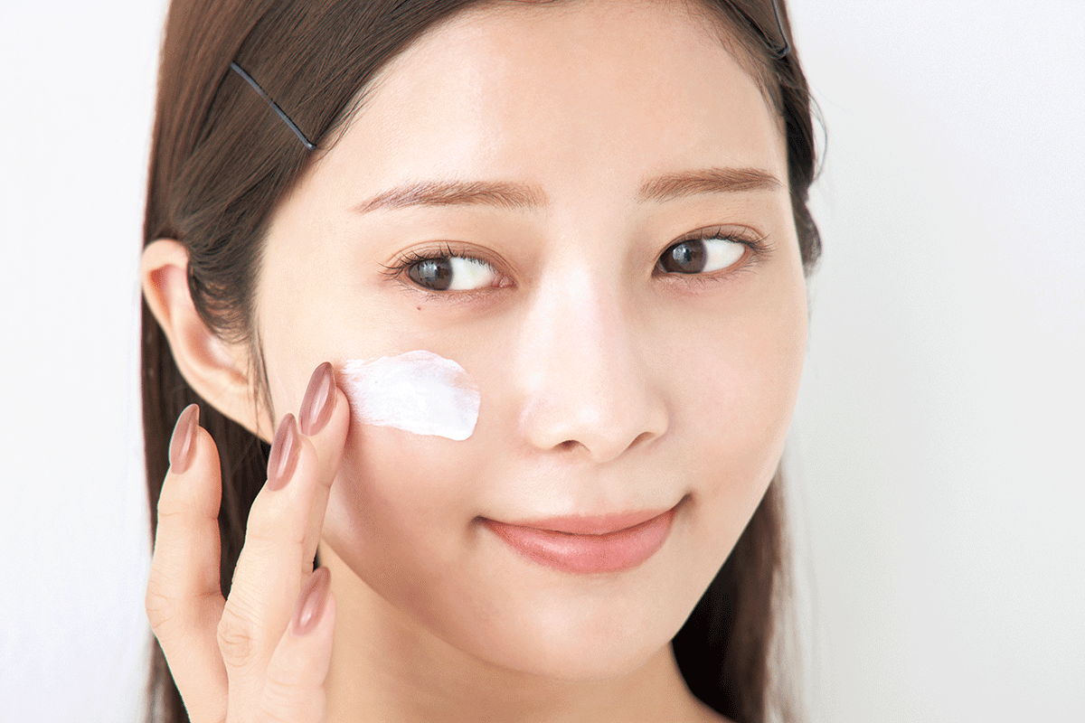 潤いとツヤを与えるクリア下地を顔の中心から外側に向かって全顔に広げる。ピュア=透明感のある肌なので、くすみのない潤いに満ちた肌に整えて。
