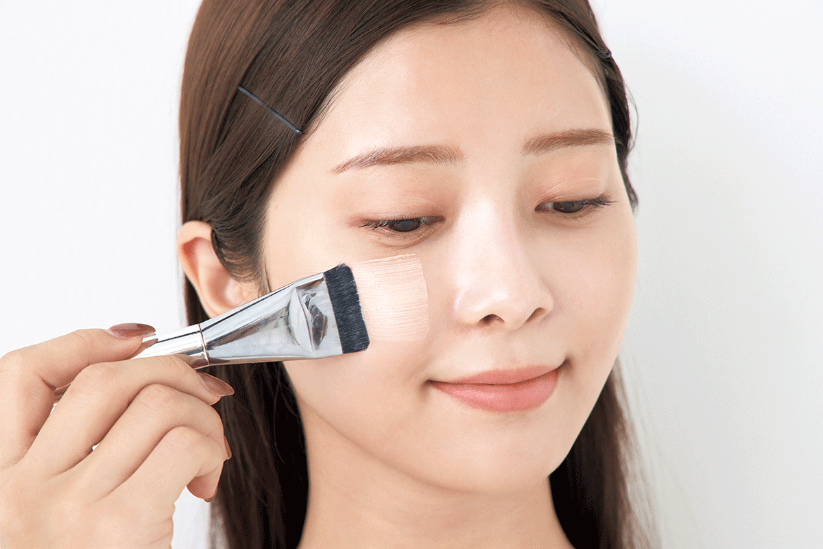 ピンク系の下地AをブラシBにとり、顔の中心からフェースラインの指1本分手前まで広げて、ナチュラルに立体感のあるベースに。