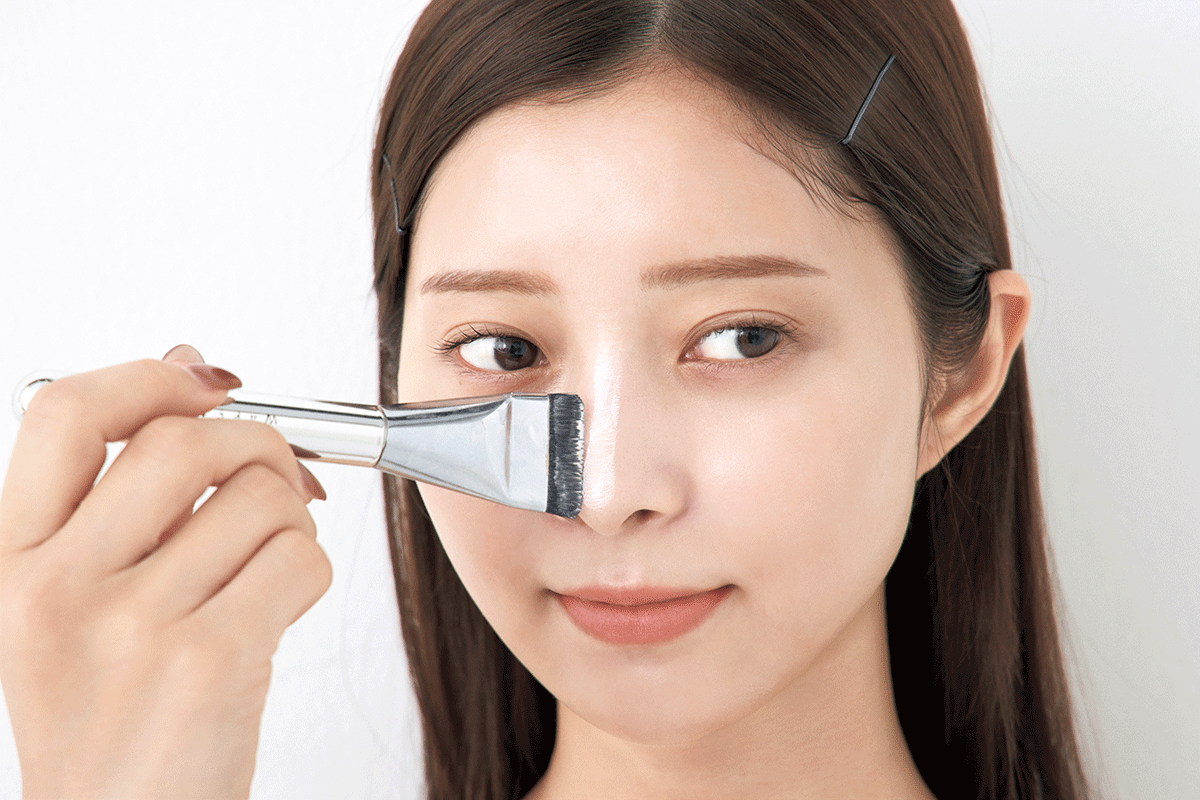 ブルーの下地を額、鼻筋、頬骨、あご先に重ねる。ピュアな印象にしたいときは、ハイライトよりもベースメイクの時点で立体感を作り込むことで、よりナチュラルにメリハリ顔がかなう!