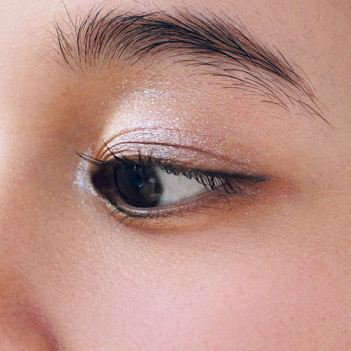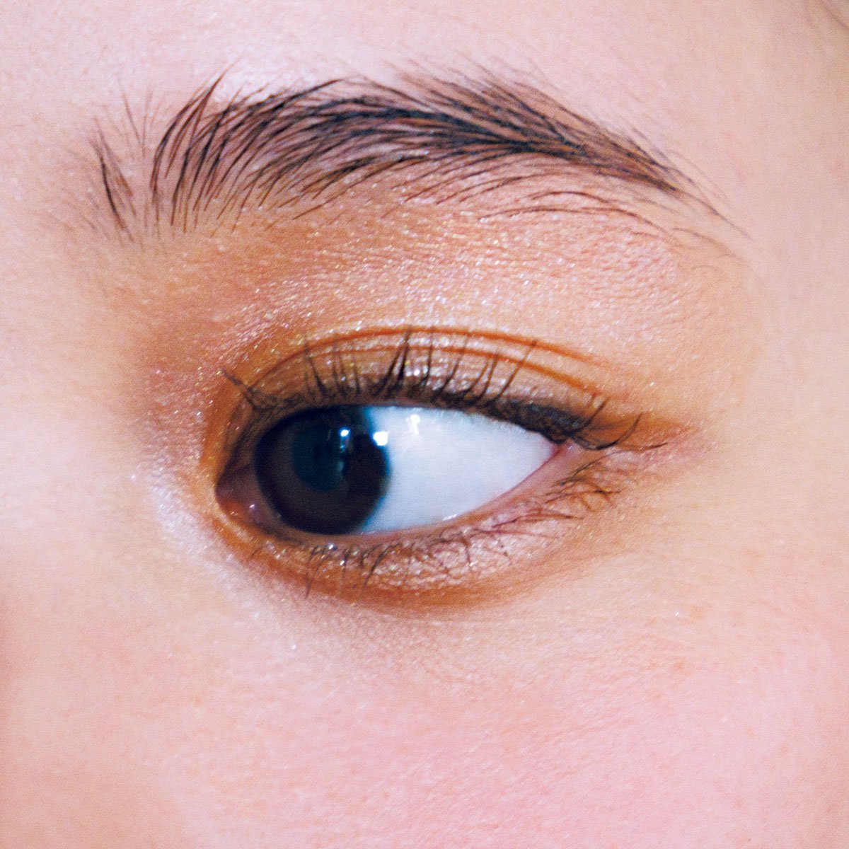 “ホームパーティなどのリラックスしたシーンで大事にしたいのは清潔感。カラーは肌になじみながら自然な陰影を演出してくれるヌーディなグレージュを。質感は肌のツヤになりすますような湿度を帯びた輝きをセレクトして。薄く淡くを意識して眉下まで広く入れると、まばたきの度にしっとり上品に艶めいて、目元の表情まで豊かに見せてくれます”