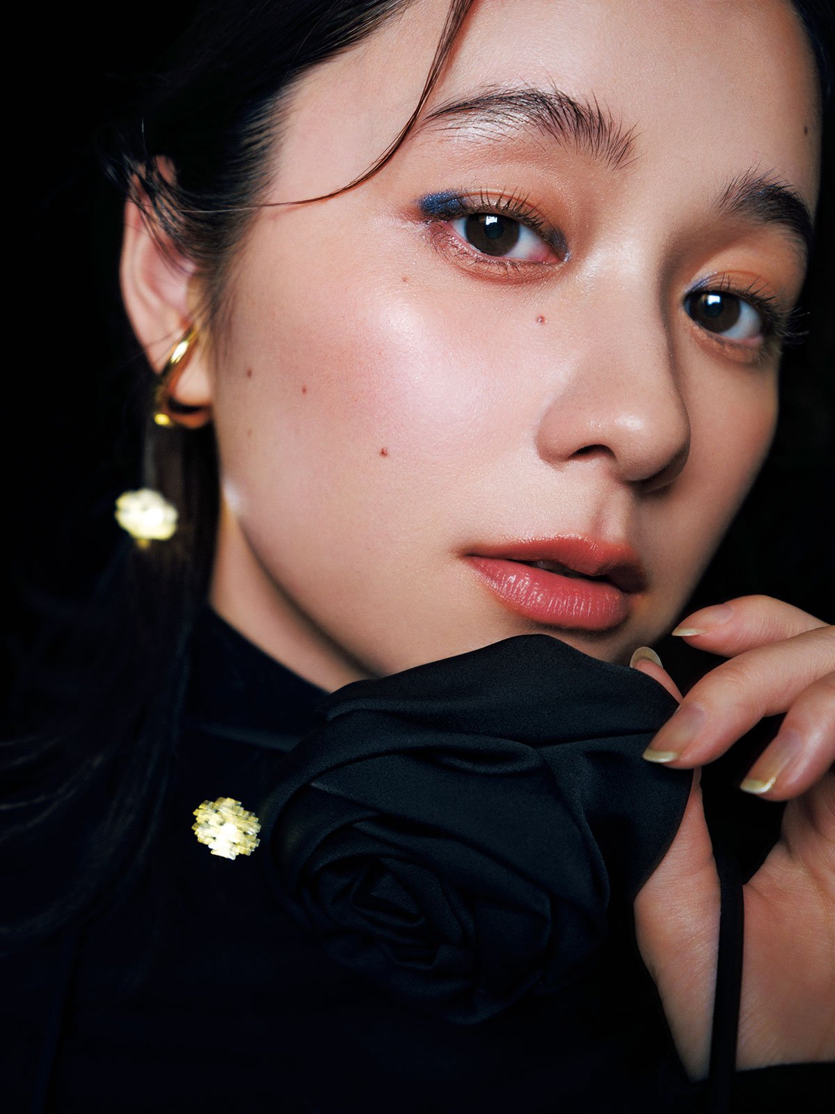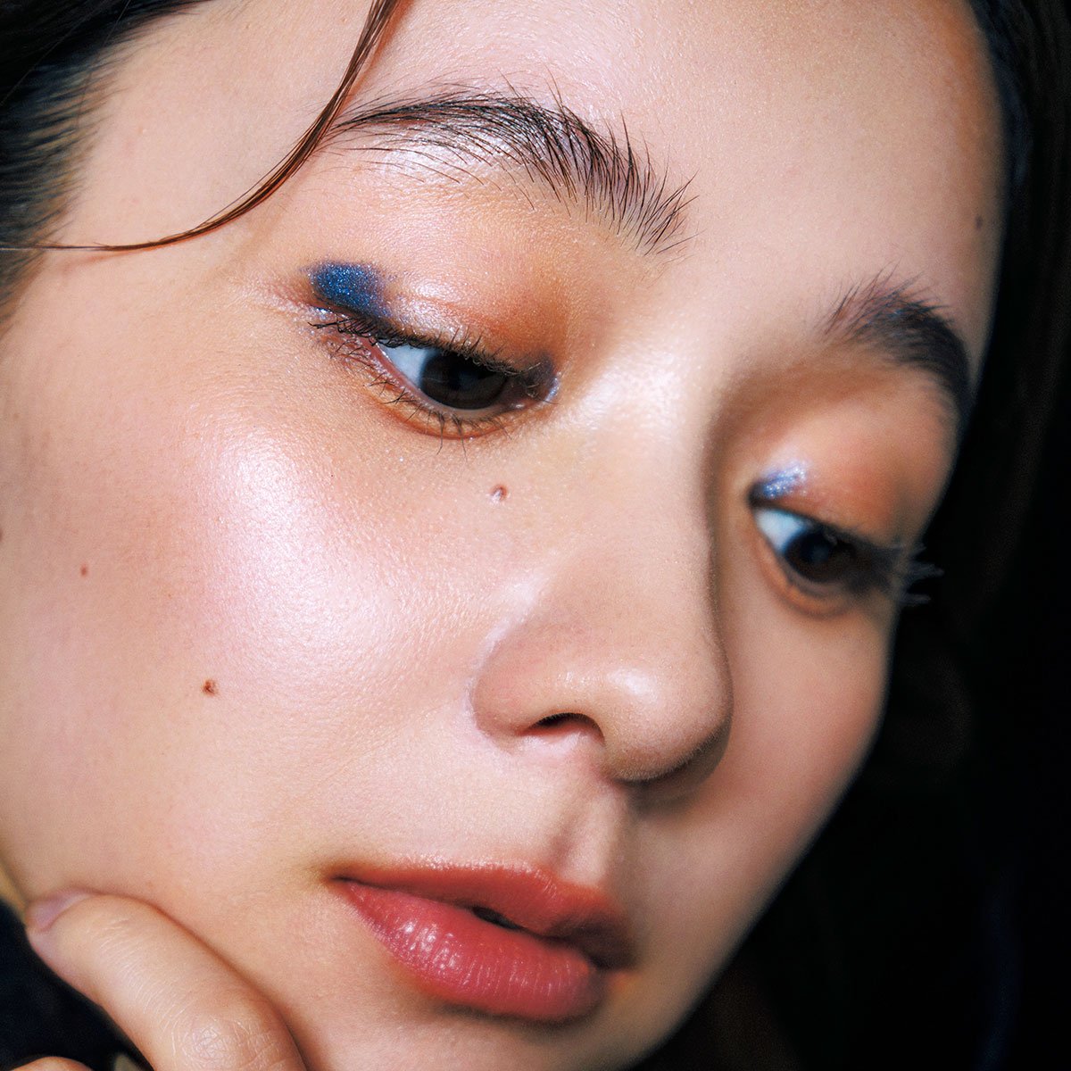 “夜の華やかなシーンにも真価を発揮するのが、地味色×スパークルメイク!人と差をつけたいなら、ついメイクを盛りたくなる場面でこそシックなカラーを選びたい。隠しパールが効いた濃紺でシャドウラインを入れると地味色でもきちんとレディな眼差しに。目尻と目頭にぽってりおくように入れることでネイビーもまじめになりすぎず、夜のお出かけにぴったりな目元に”