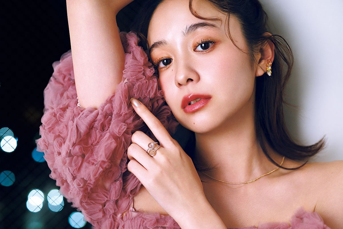 トップス¥6,500(tageechita) ベスト¥15,400(anuke 新宿LUMINE2店〈anuke〉) “e.m.”イヤカフ[上]¥84,700・イヤカフ[下]¥111,320・右中指リング¥216,590・“little emblem”右小指リング¥99,220・左人差し指リング¥200,800(e.m. 青山店)