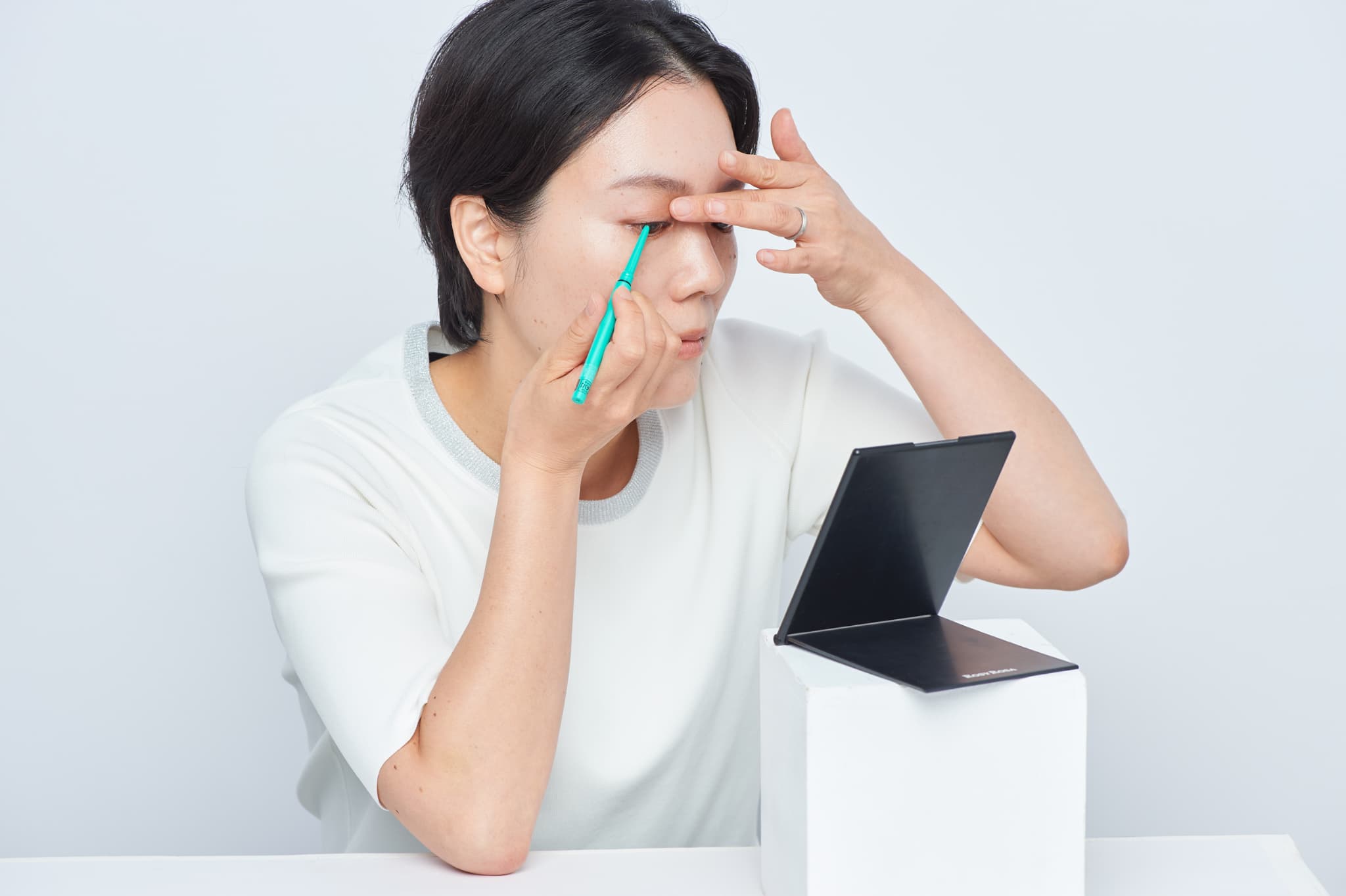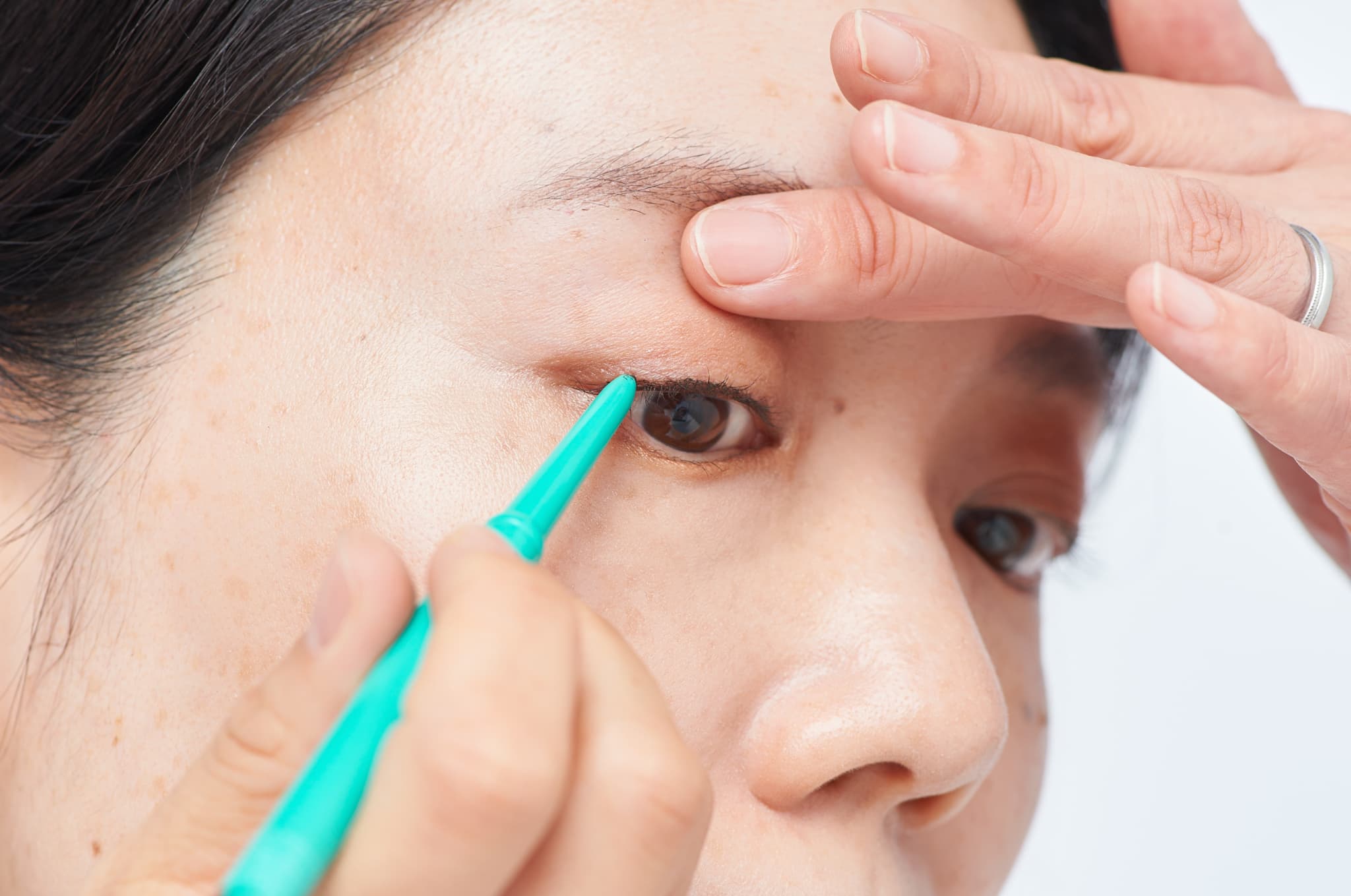 \肘は机に固定し、まぶたを軽く持ち上げて!/