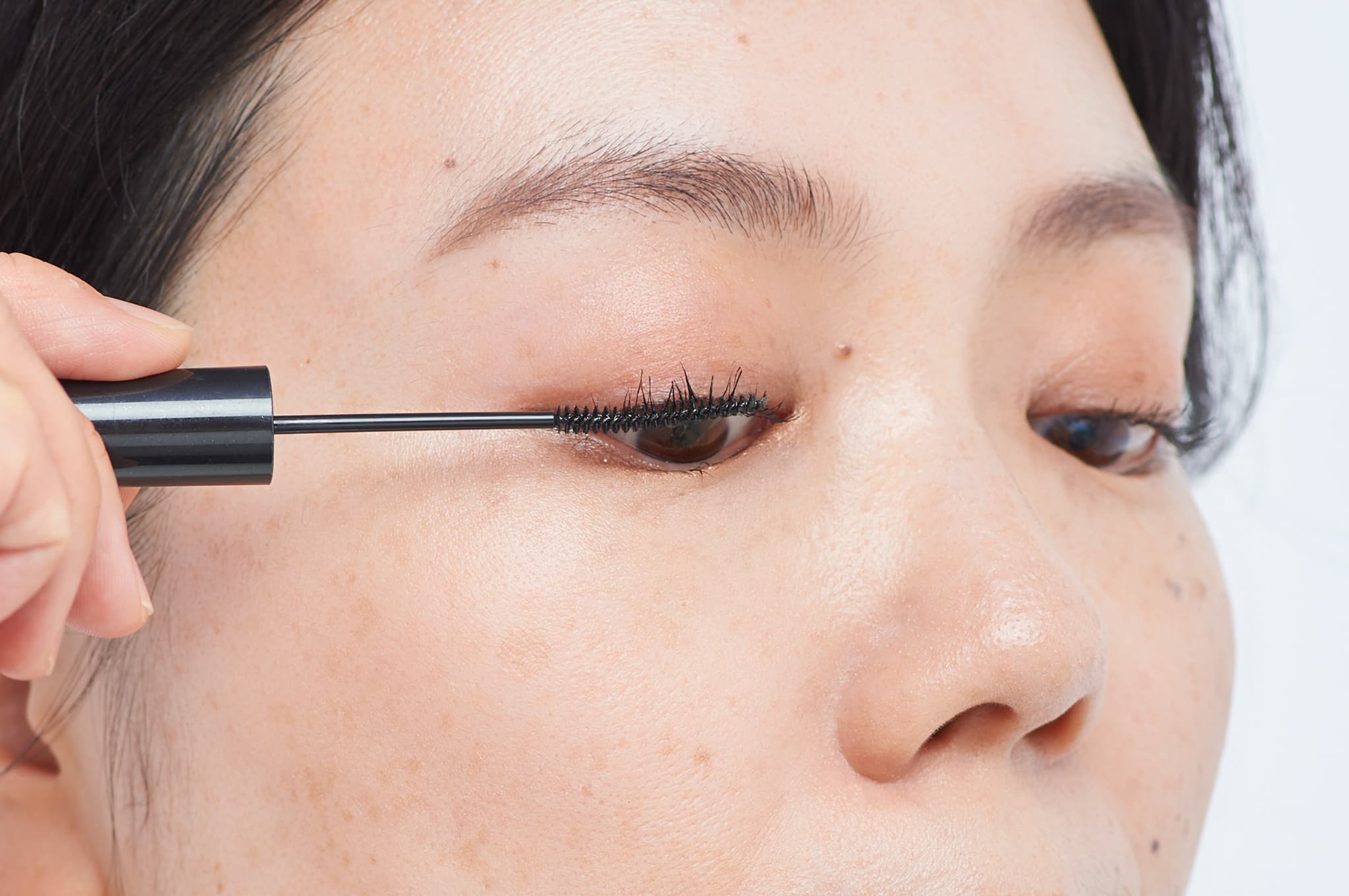 「顔立ちがぼんやりして見えるとお悩みの方は、マスカラは迷わず黒を。毛を一本ずつ太く、主張させるイメージで根元にしっかり密着させてからサッと流します。短い毛も逃さない細ブラシで上下に丁寧に塗れば、瞳に光が入り、顔立ちまでハッキリ見えてきます」(yumiさん)