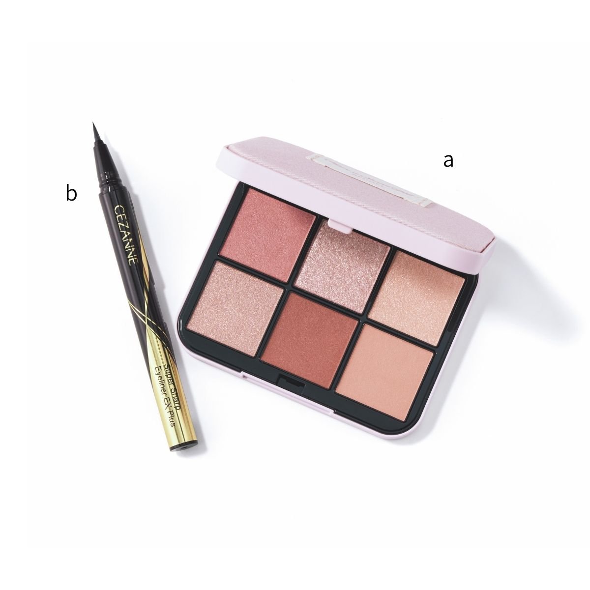 aの右下を上まぶた全体に広げ、左上をアイホールに重ねる。下まぶたは全体に右上を広げて艶めかせ、下段中央&左上を混ぜて目尻側2/3に細めに重ねて締める。上段中央を指でとり、上まぶたの中央にオン。bを上まぶたのキワに引き、目尻は2mm程のばして。マスカラはこげ茶。