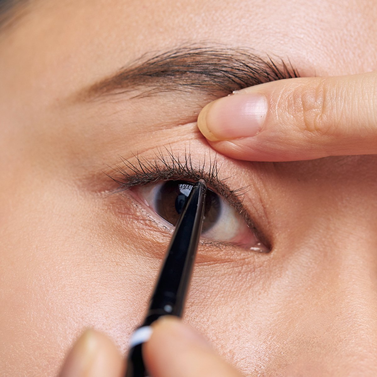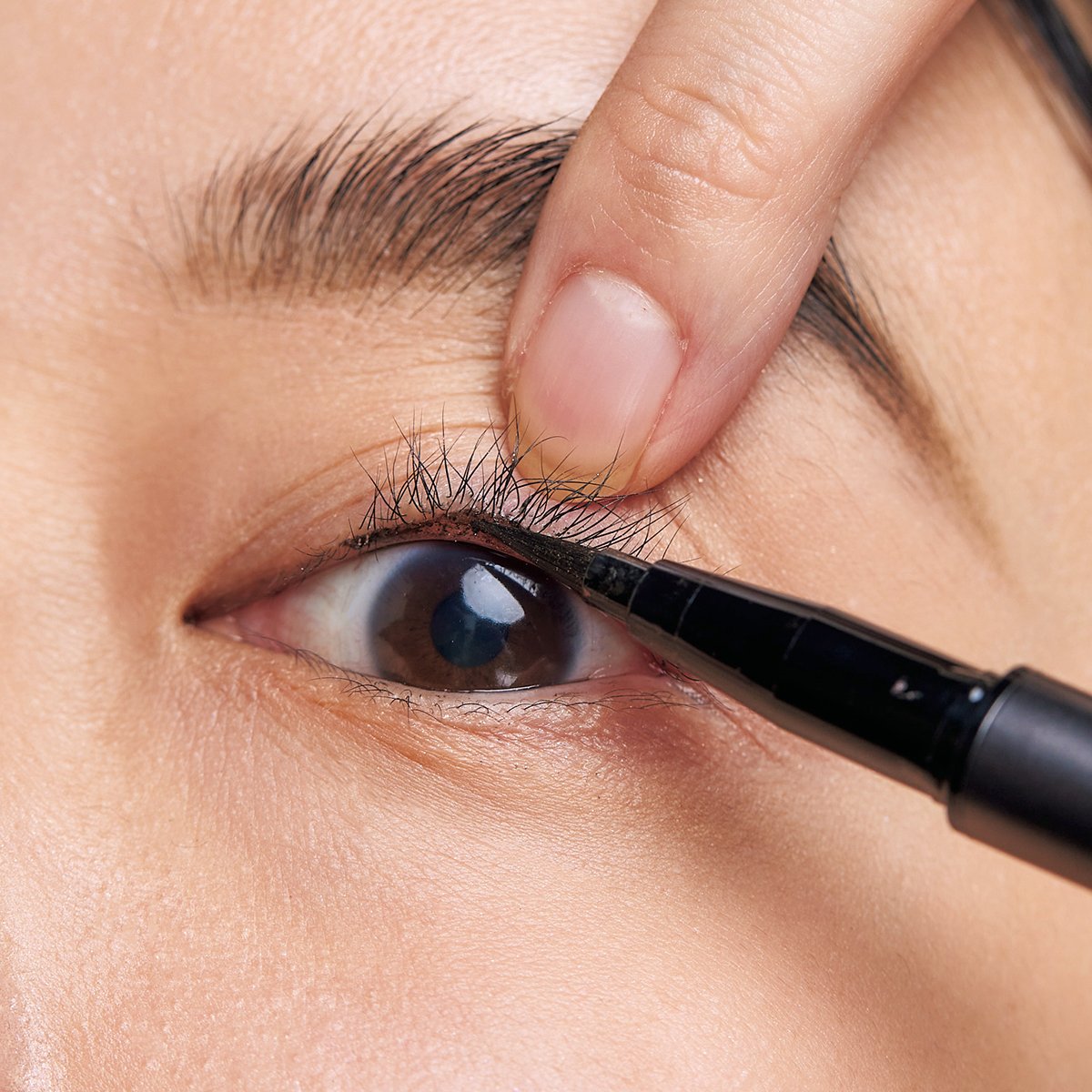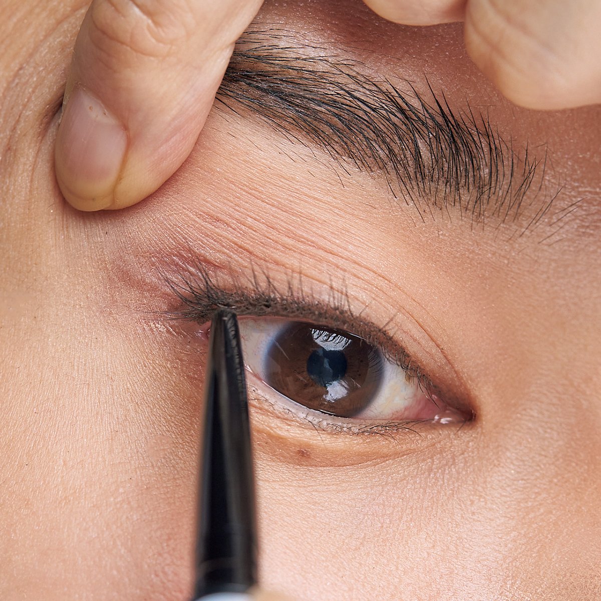 まぶたを軽く持ち上げ、まつ毛の下からペン先を斜めに差し込んで描く。黒目の中央から左右へワイパーのように動かしながら、まつ毛の際全体を埋めていく。