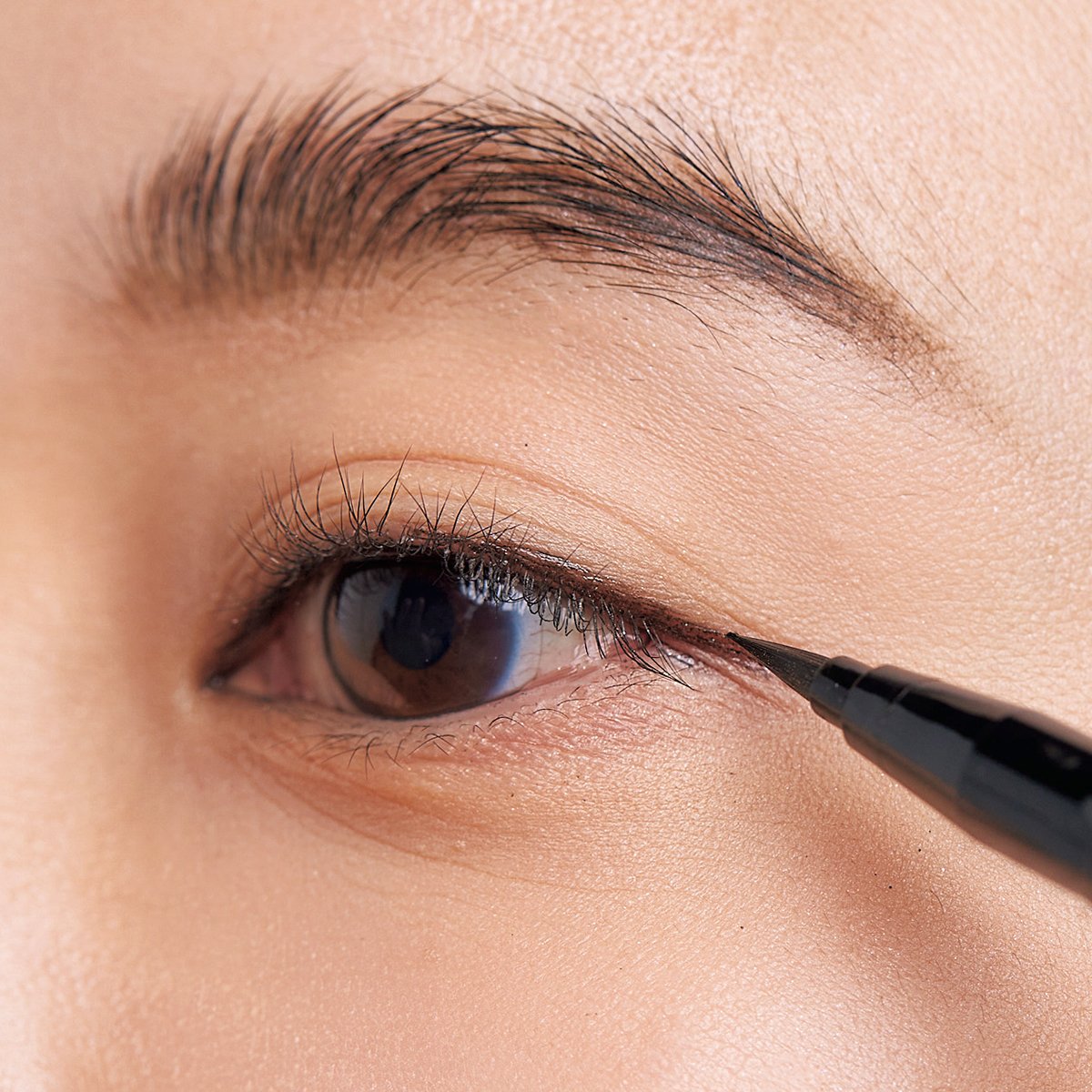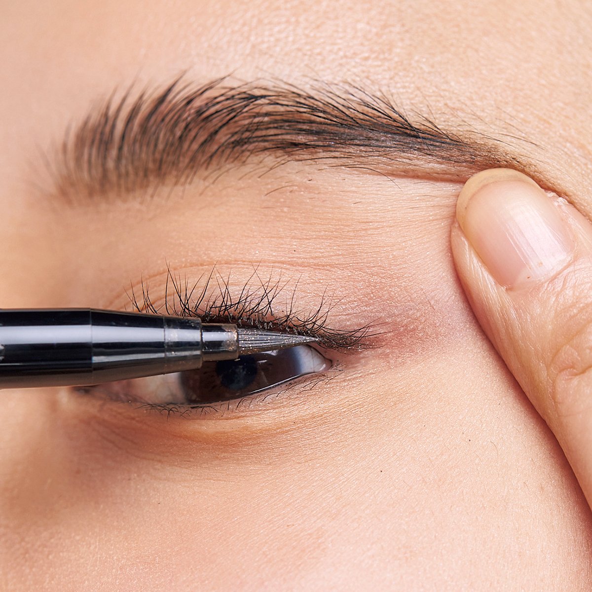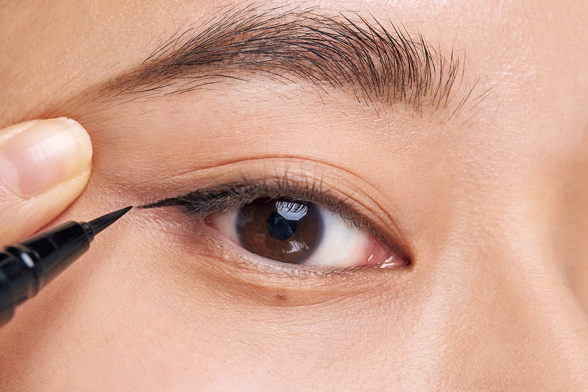 まぶたを軽く持ち上げ、まつ毛の下からペン先を斜めに差し込んで描く。黒目の中央から左右へワイパーのように動かしながら、まつ毛の際全体を埋めていく。