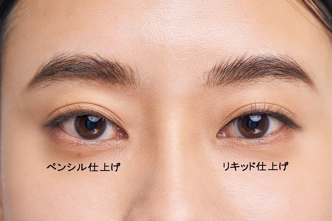 描いた線がくっきりとして、より目力を強める力があるのがリキッド。ペンシルはなじみ込む自然なニュアンスがもち味。ちなみに右ページの写真はリキッドで描いています。